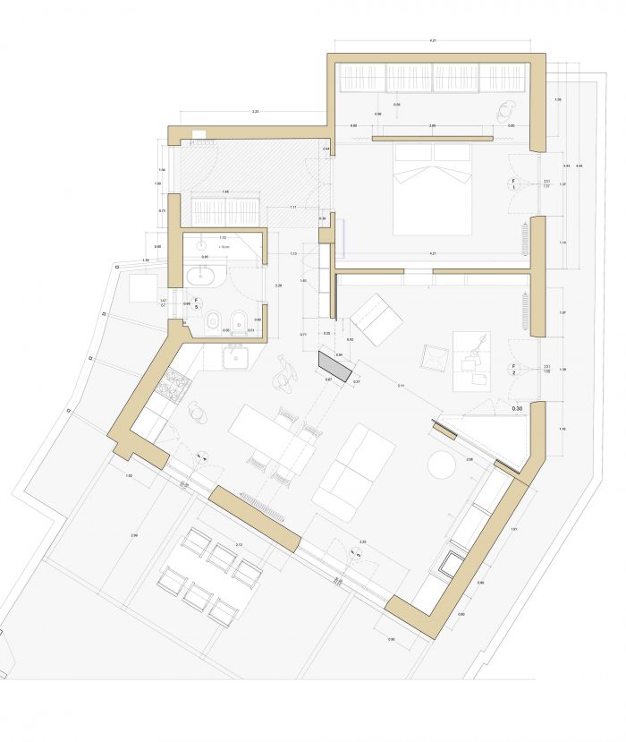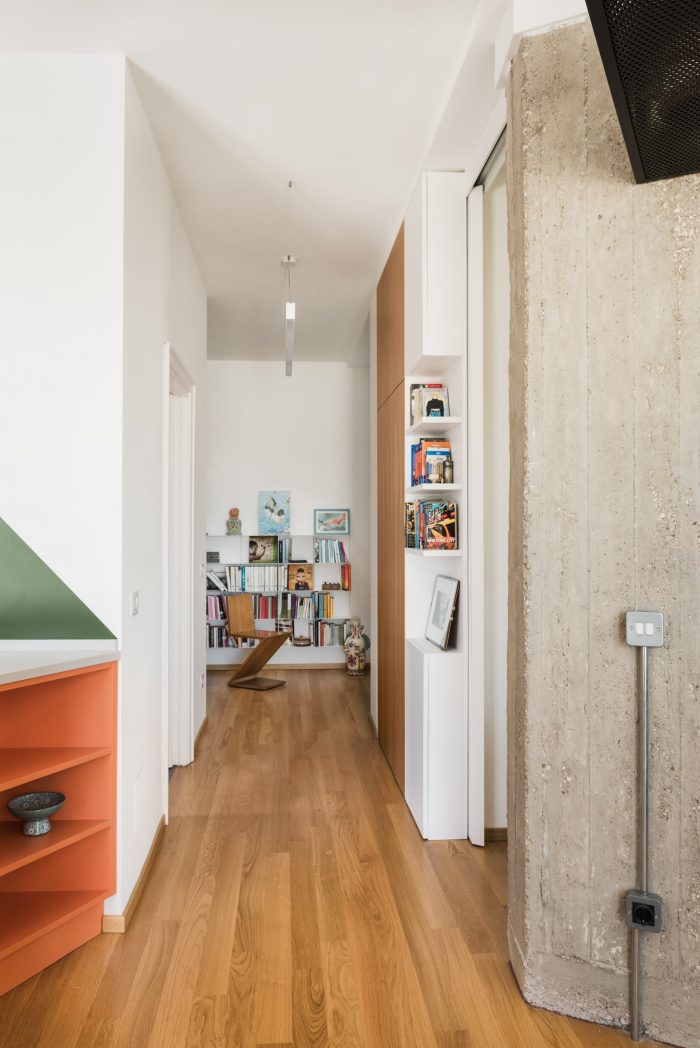The kitchen exploits a handcrafted obtuse corner, while the hallway, study, and living room, thanks to a system of sliding panels, gain that indefinable relationship given by the mobile boundaries, control of spatial permeability in the service of needs, light, mood.