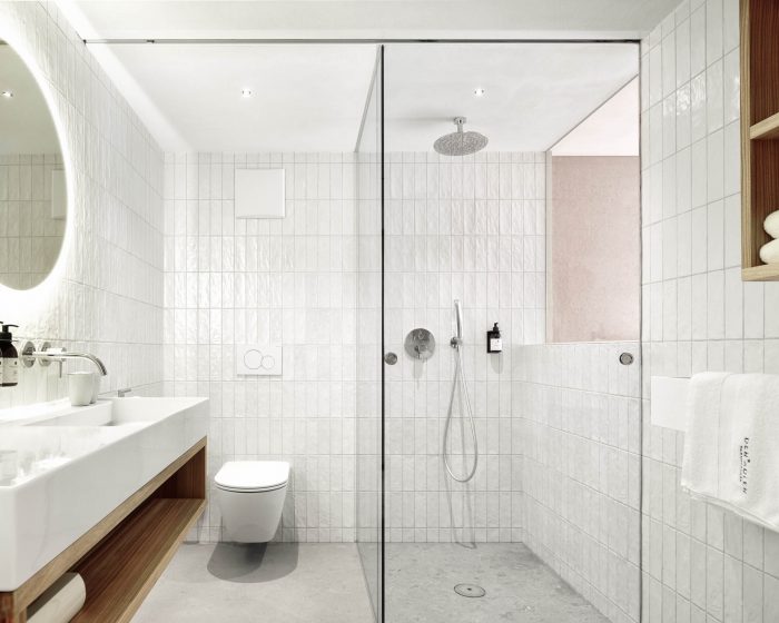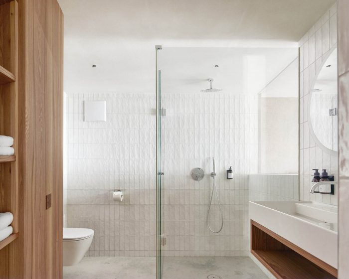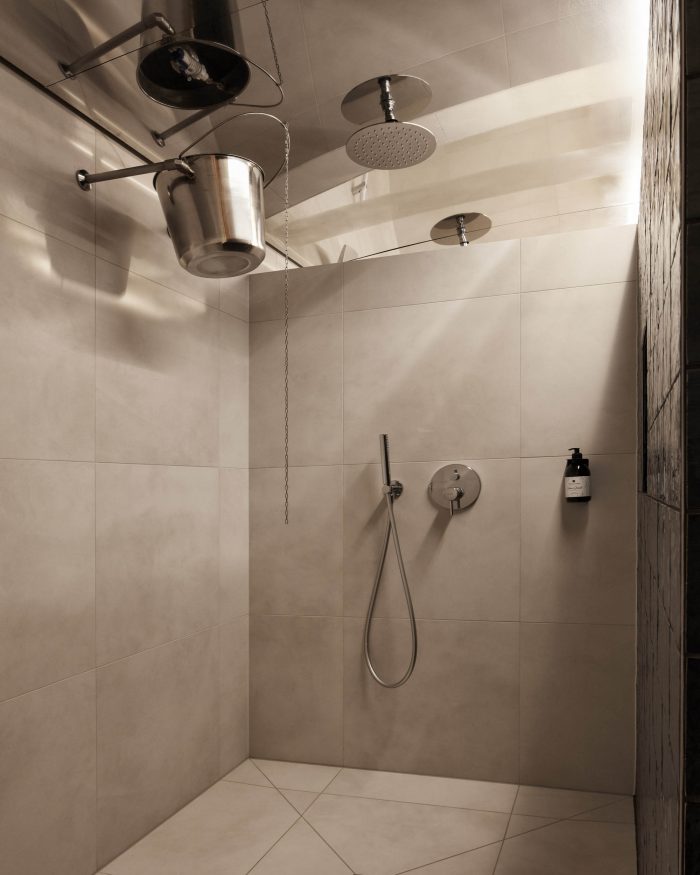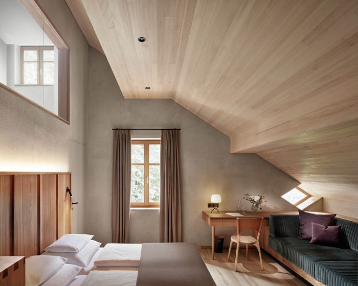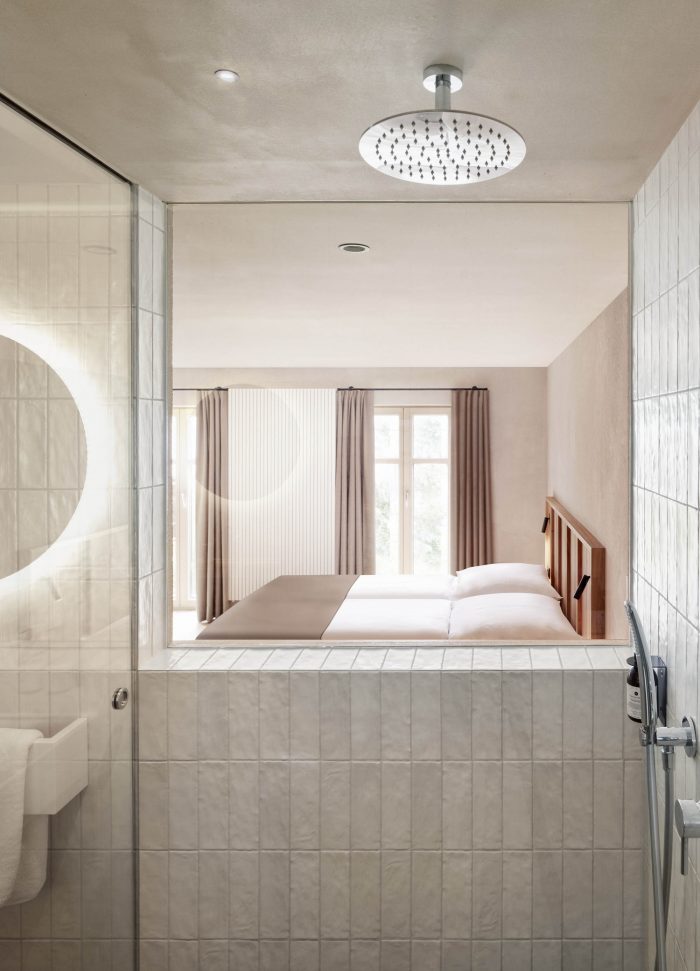 The new hotel rooms have wooden floors of ash. The walls and ceilings are made of lime plaster. The tailor-made built-in furniture is made of oiled elmwood, complemented by dark green velvet sofas. The bathrooms have a natural stone floor and cream-white hand-made tiles on the walls.