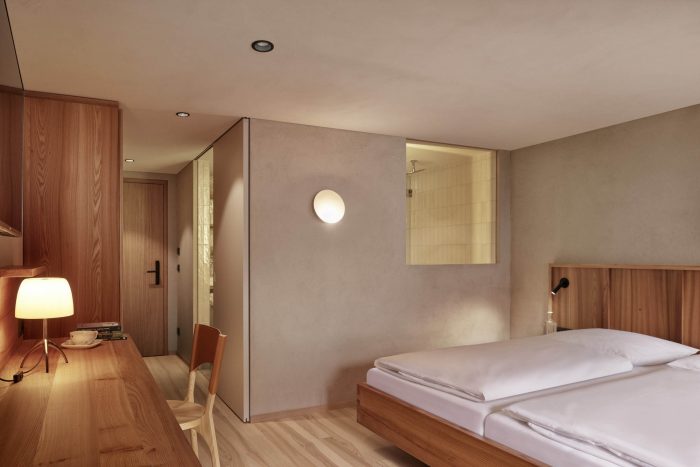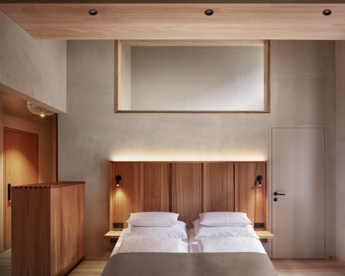 新的酒店房间有白蜡木地板。墙壁和天花板是由石灰石膏制成的。定制的内置家具由涂油的榆木制成,辅以深绿色的天鹅绒沙发。浴室有天然石地板,墙壁上有乳白色的手工瓷砖。