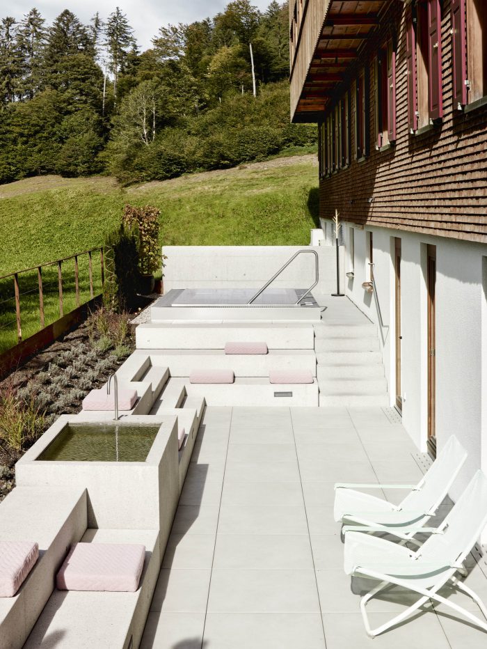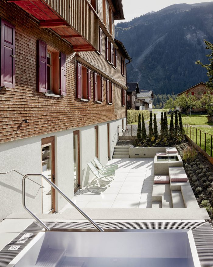 The wooden relaxation room contains specially designed loungers and matching niches made of dark blue textiles. Generous French doors lead to the outside area. Here the guest can lay on loungers or sit on the sandblasted concrete steps around the fountain. A few steps higher is the outdoor pool from which one can look through the village into the mountain scenery. The architectural transformation of the main conceptual anchors enables the hotel guest to stay in touch with locals and the region. He is able to be an active participant or a silent observer.