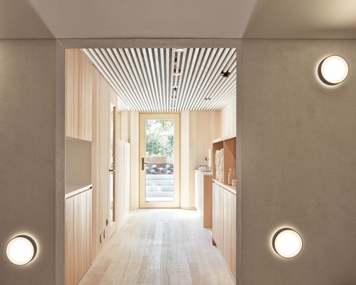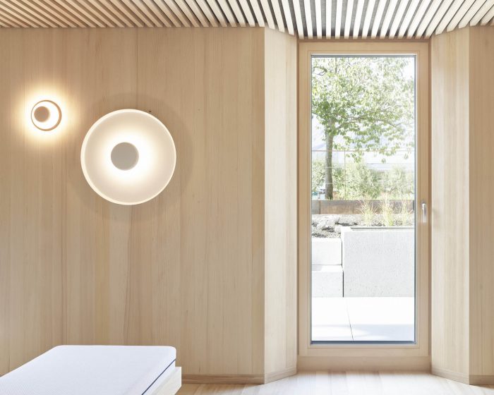 The ceilings are made of clay panels with white clay plaster. The subtle basic lighting and exclusive object lights increase the spatial qualities. The wellness area was surprised with its generosity due to the connected rooms and the beautiful garden view. The entrance area is flushed in colored light and leads to the saunas, showers, or the juice bar with an adjoining relaxation room. A high-gloss polished stainless steel ceiling in the showers seduces the view upwards.