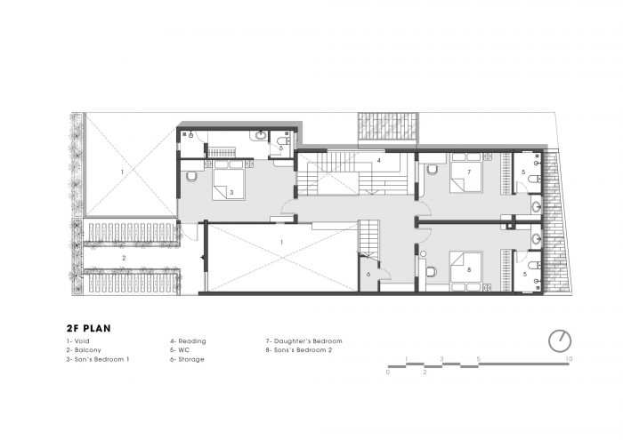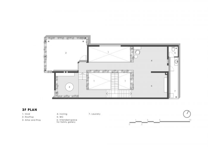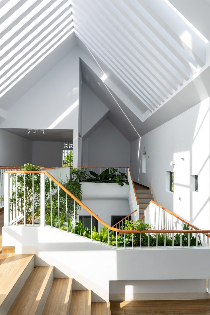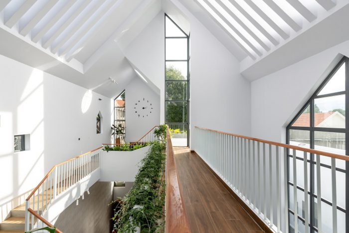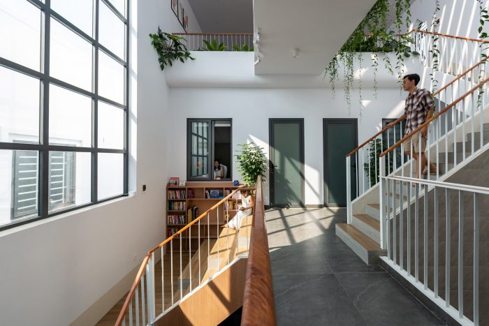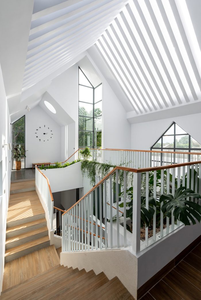 Up to the 2nd floor is the space for the children, including 3 bedrooms, these bedrooms face the lobby and common corridor, an area where the children can interact and connect regularly. The stair landing space is designed to be large to combine as a reading area, the wide corridor also incorporates a bar to relax together. From the lobby, corridor, and stairs of the 2nd and 3rd floors, you can observe and connect the kitchen and living room areas thanks to the atrium. so that the children can watch the mother cook, and feel the taste of the food. The front 3rd-floor area is a family prayer retreat area with a window overlooking the church and a terrace for trees and relaxation.