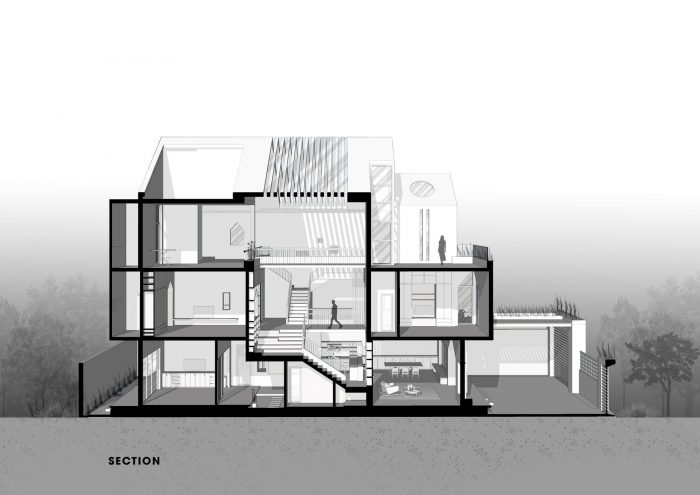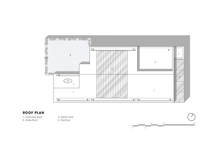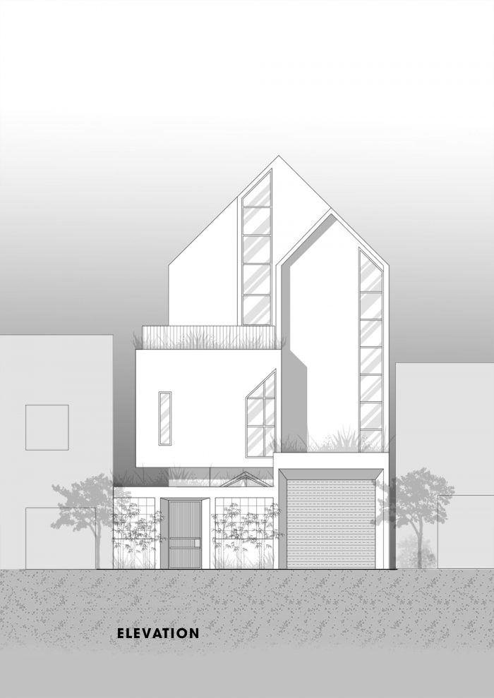 后面是计划开发的空间,作为家庭纪念品的画廊,以及晾晒的空间。房子中间的屋顶空间是由混凝土板条与玻璃屋顶结合而成,以帮助引入自然光,并以天主教家庭的精神 当上帝创造这个世界时,创造了光。因此,自然光是非常重要的,在不同的位置切割许多门洞,结合房子中间的玻璃屋顶,在墙上形成许多交替的光线,使空间变得有趣。屋顶的窗户和立面采用了金字塔形的设计,以配合附近教堂的形状,在外观上形成了一个和谐的整体,而内部的设计则是简单明了的。利用自然光作为亮点,每小时都会改变光线,这样我们就不会感到无聊了