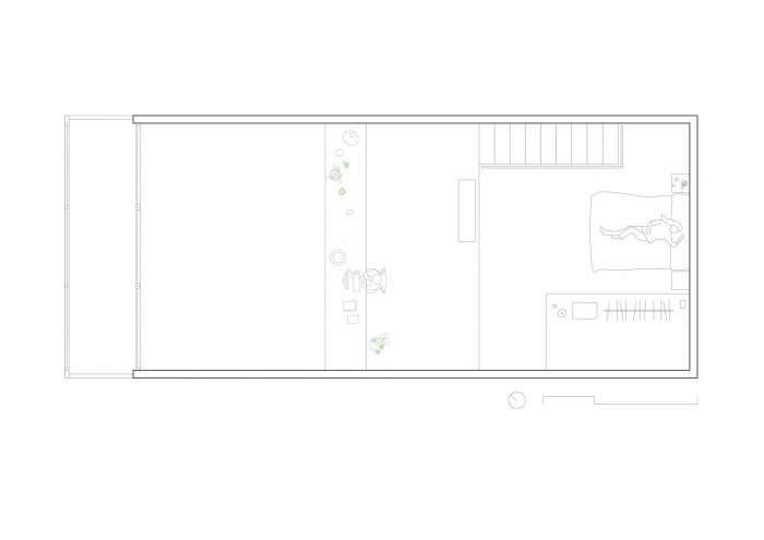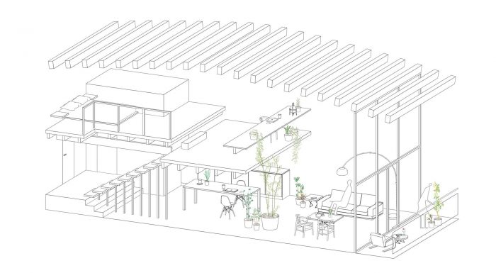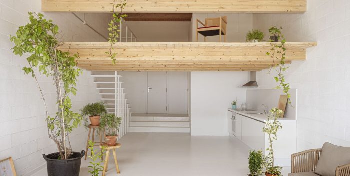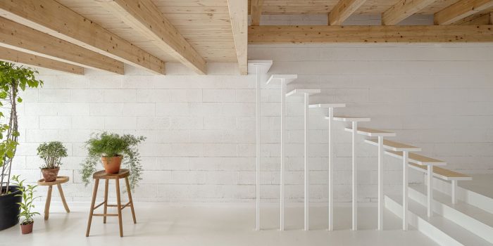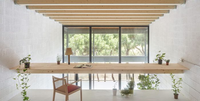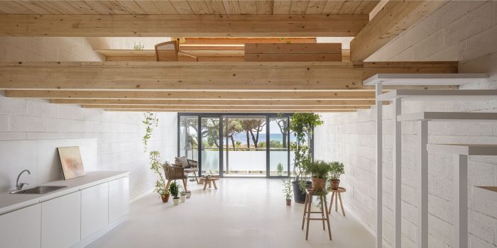 Materiality: The design proposes two construction strategies that lead to a unitary language and a new space identity. The first provides maximum light to the house, by painting white the floor and concrete block walls. The second design strategy puts emphasis on the horizontal planes. Cross-laminated timber fir beams, together with the tongue-and-groove boards, contrast with the new abstract environment created. The choice of materials responds both to searching for an aesthetic and to achieving a sustainable intervention. Nature: The presence of an interior garden aims to expand the vegetation of the beach into a new interior natural atmosphere. In this way, the project is an opportunity to bring humans closer to our natural origin.