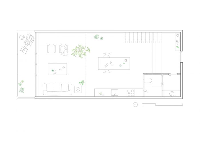 A sculptural staircase gives access to the new mezzanine on two different levels, the study, and the bedroom. The third horizontal plane is also suspended between the two perimetral walls. It forms a long table that also prevents the users from falling to the lower floor. Descending a few steps from the entrance, the low-height kitchen and dining room compress the space vertically. In the place closest to the sea, the space is expanded again. The living room is conceived as a double-height interior garden, enlarging the small balcony in an environment full of light and nature.