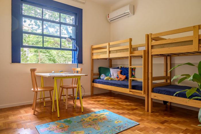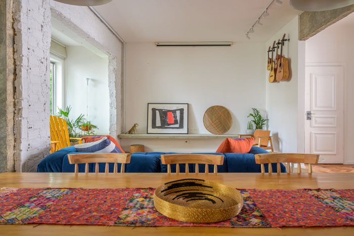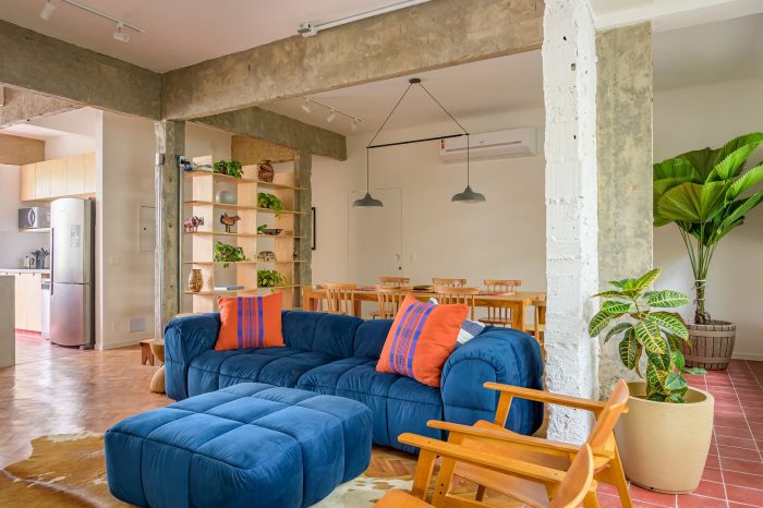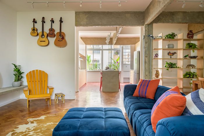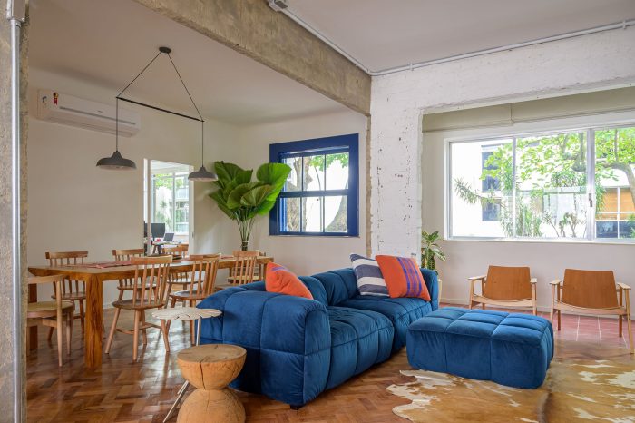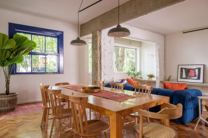 A house-like apartment. Located on the first floor of a small apartment building from the 50s in Leblon, Rio de Janeiro, this 130sqm apartment has original features that were decisive for our client when he chose this space as his new home. High ceilings, original hardwood floors, blue wooden shutters, and a beautiful view from the trees.