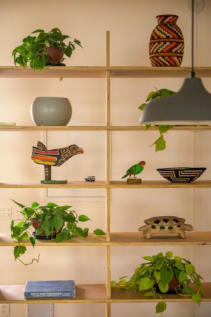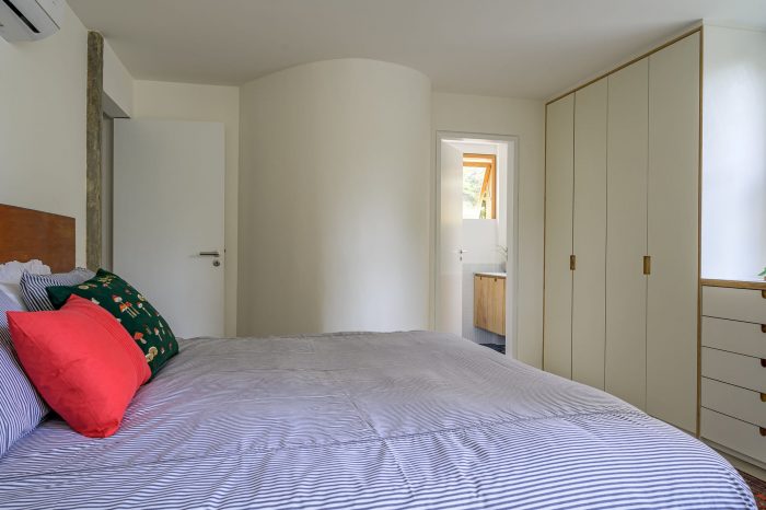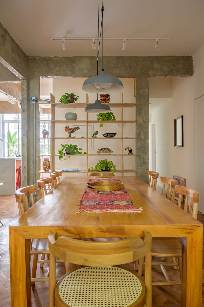 Usually, in old apartment buildings, there are always structural limitations found during the demolition stage. An old corridor that was supposed to be eliminated on the original project, was found to be delimited by two pillars that stood too close to each other. Therefore, our solution was to demolish the wall between them and place an open bookshelf. Creating a more integrated space that still maintains the privacy of this circulation area.