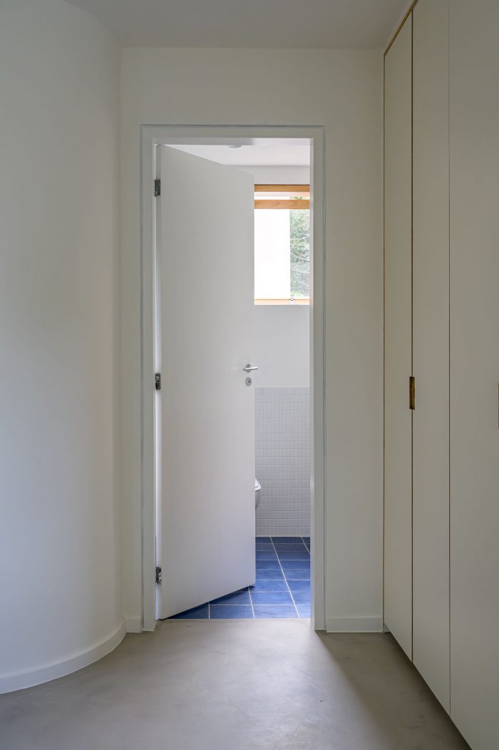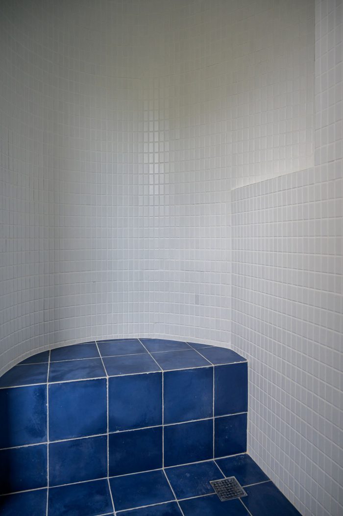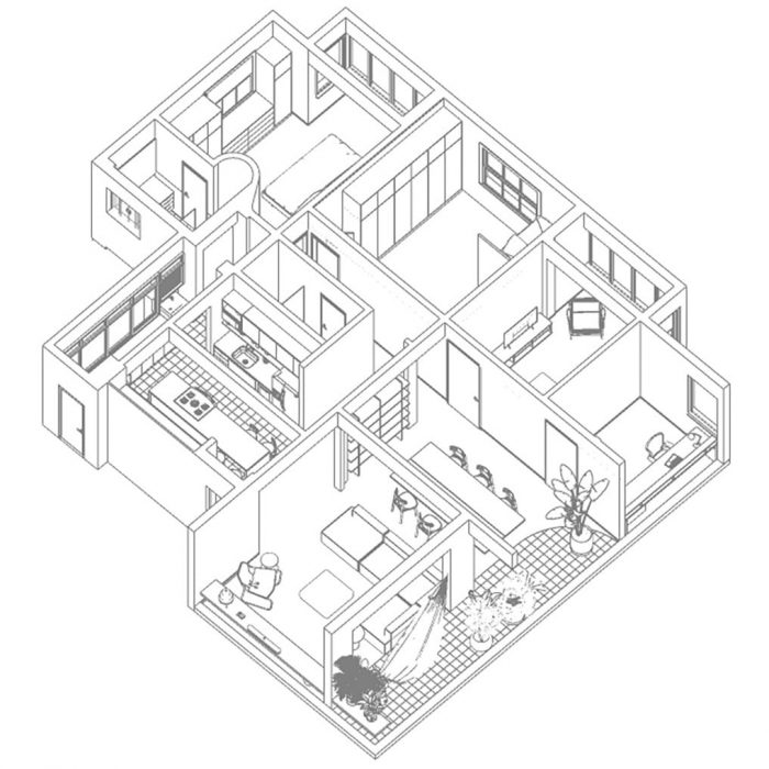 不同的地板饰面标志着公寓的不同用途。水力砖被用在一个门廊上,这个门廊以前被纳入了客厅、厨房和浴室。我们在可能的地方恢复了原来的硬木地板(客厅、餐厅、家庭办公室、客人和儿童卧室),在私人流通区和主卧室使用了水泥地板。木制窗框被漆成蓝色,与外立面的颜色相同。通过空间质量和材料,我们试图为一个住在公寓里的3人家庭创造一个房子般的氛围。