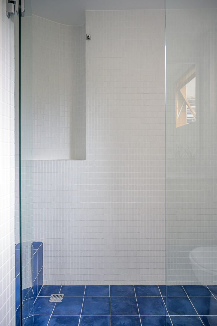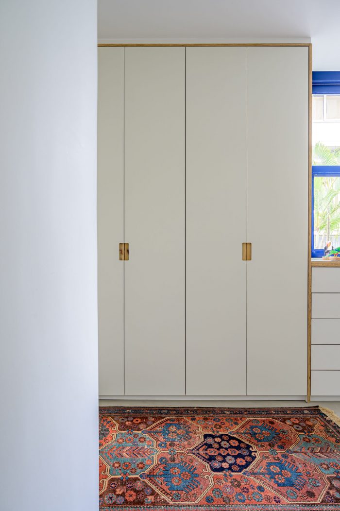 Different floor finishes marking different uses of the apartment. Hydraulic tiles were used on a porch that was previously incorporated into the living room, kitchen, and bathrooms. We recovered the original hardwood floor where it was possible (living room, dining room, home office, guest, and children's bedroom) and a cement floor for a private circulation and master bedroom. Wooden window frames were painted blue, the same color they have on the outside façade. Through spatial quality and materiality, we sought to create a house-like atmosphere for a family of 3 people living in an apartment.
