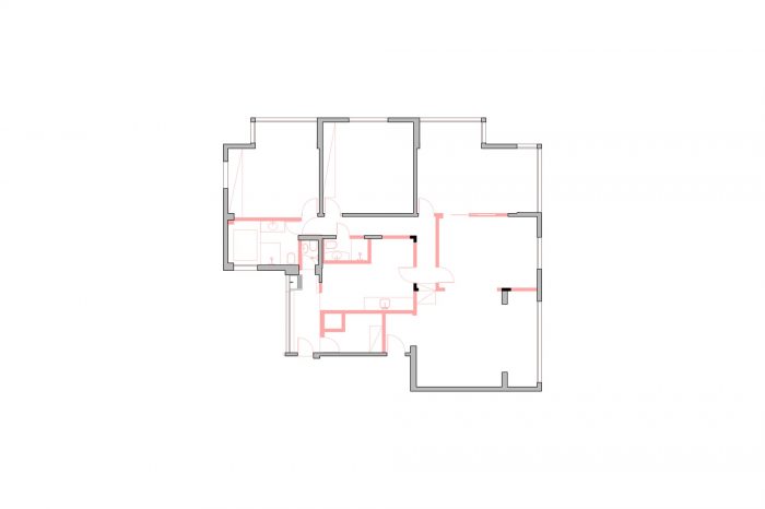以前对公寓的改造没有什么标准,通过去除一些层次,我们能够发现一些原始的元素,如地板和窗户,这些元素在被恢复后,是恢复原有气氛的关键。混凝土梁、柱子和拆除时露出的砖砌门廊也被暴露出来。