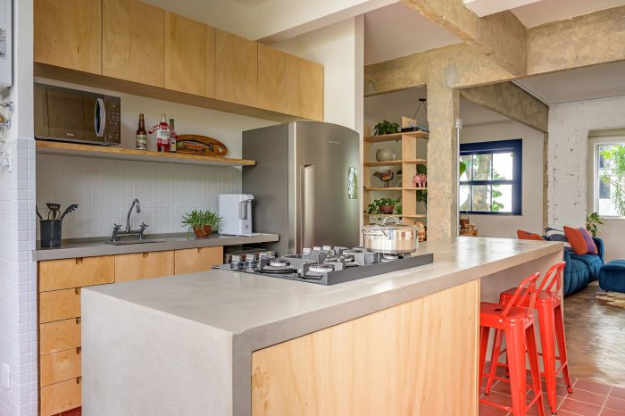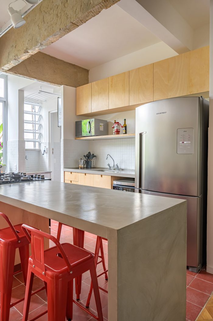 The previous remodeling of the apartment had few criteria, and by removing some of the layers we were able to discover original elements such as floors and windows that after being recovered, were key to bringing back the original atmosphere. Concrete beams, pillars, and a brick portico revealed by demolition were also left exposed.