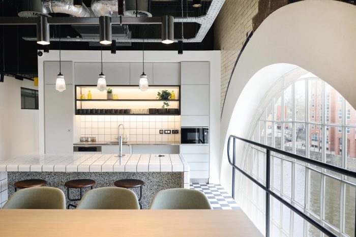 The talent and history of the local community can be seen throughout, with artwork from local artists and nods to the building’s industrial past and waterside setting with subtle nautical references including rope light installations. The once derelict building has now been transformed by the inventive design to bring new life to Bristol’s harbor for its thriving community of creatives, entrepreneurs, and start-ups.