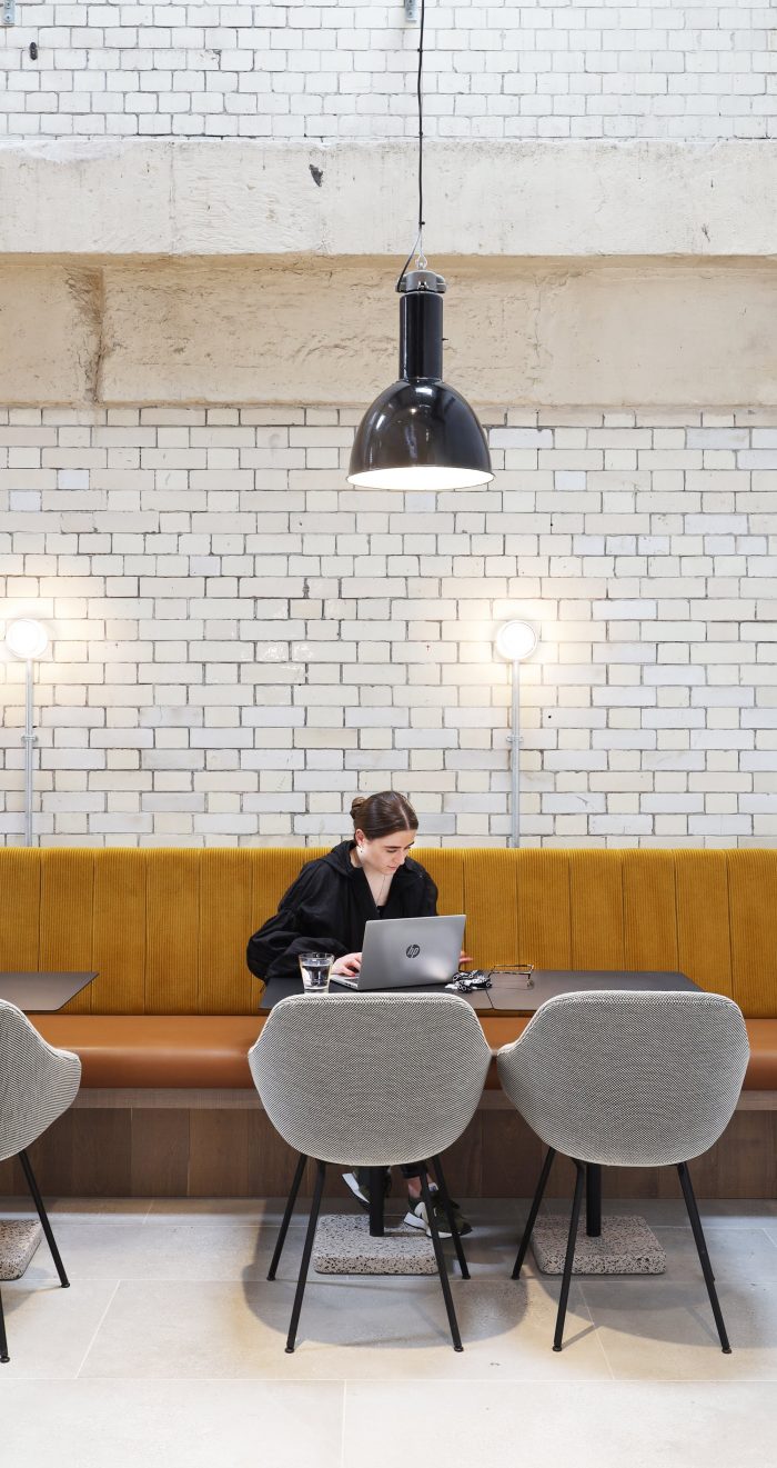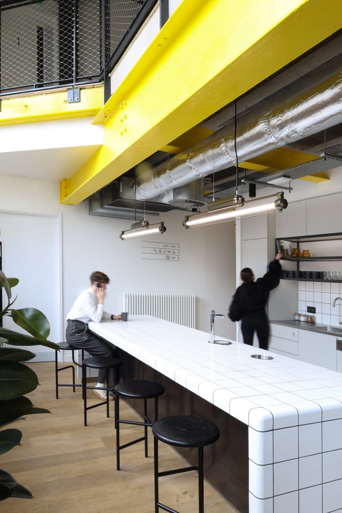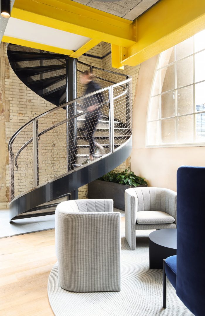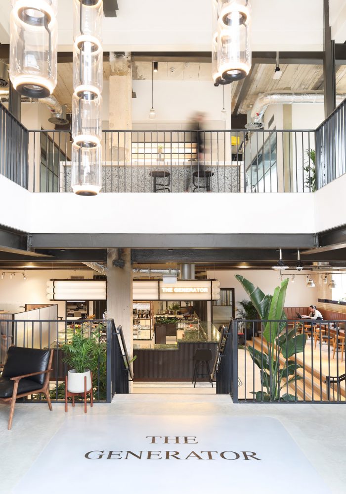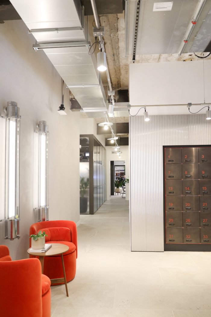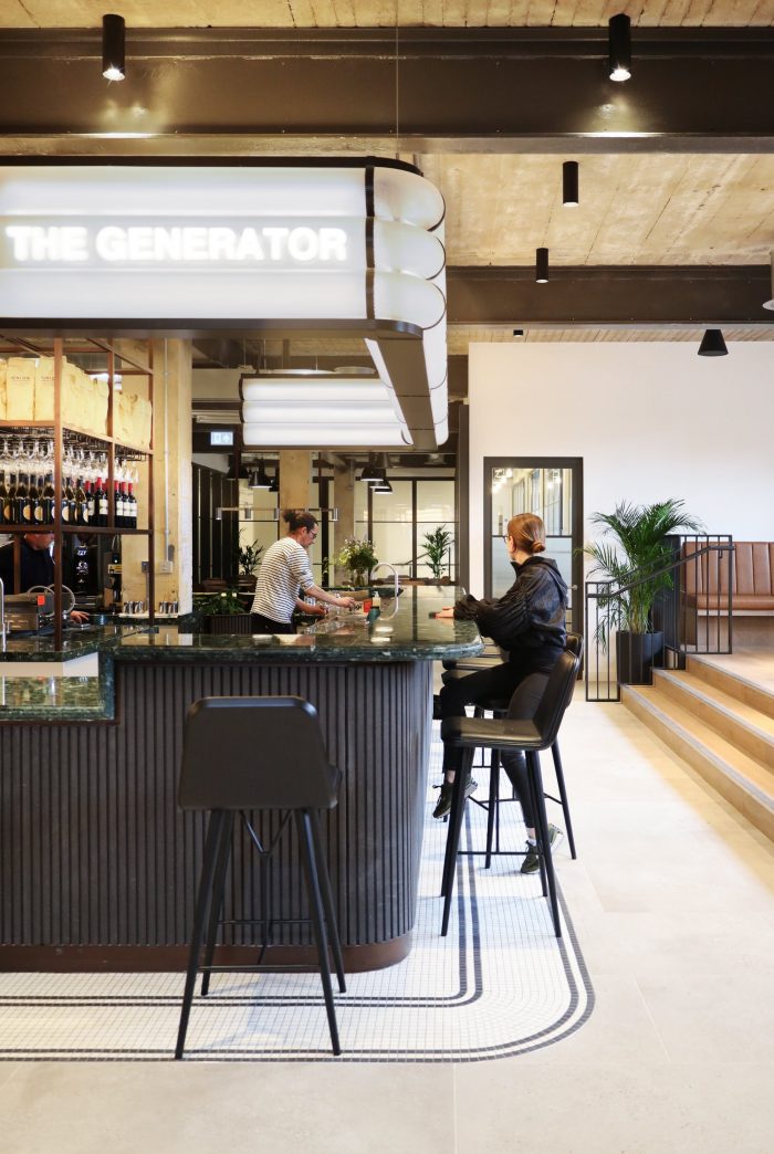 MoreySmith looked to elevate the industrial features of the architecture by including corrugated metal, mosaic floors, and reclaimed industrial lighting as design features and interventions. A bar for events and daily refreshments is new to the space, featuring a bespoke overhead light installation formed of prismatic acrylic inspired by the flow of electricity. A club lounge sits adjacent to the bar to activate the street presence of the building and to serve as a café area that is open for the wider public to enjoy.