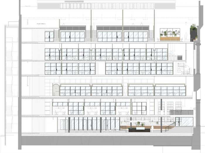 Featuring bright, airy double-height spaces, natural light has been prioritized throughout with high ceilings and features that provide views of the waterways to provide a soothing element to the space. This is juxtaposed with repurposed marble terrazzo adding modern accents to the buildings existing features, with contemporary furnishing and an abundance of planting to provide visual access to nature.