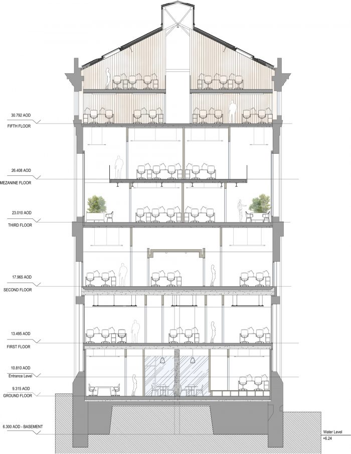 为了重新想象现代使用的空间,新的内部元素已被敏感地添加到建筑中,同时保持建筑的核心结构不受影响。在五楼,在现有的桁架之间引入了吊舱结构,以最大限度地增加体积,并创造出夹层办公空间,通过大舷窗可以看到下面的水道。