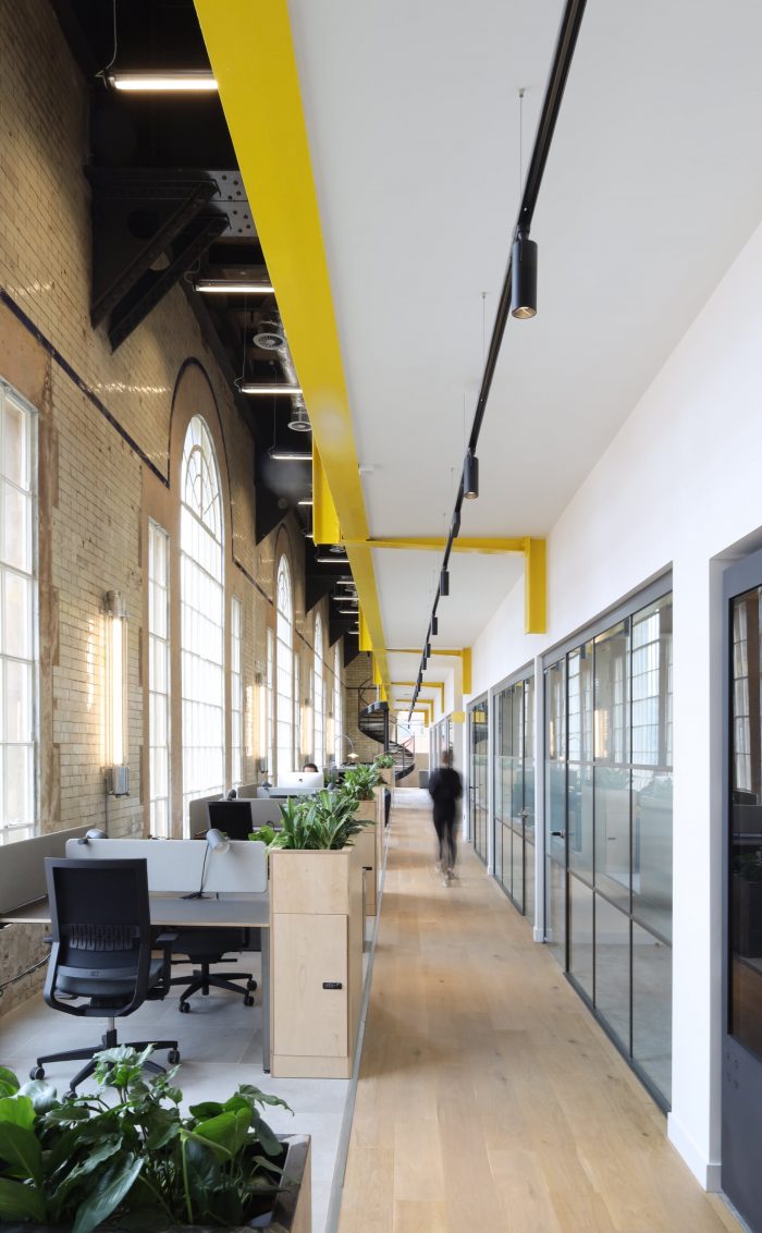 In order to reimagine the space for modern use, new interior elements have been sensitively added to the building while leaving the building’s core structure uncompromised. On the fifth floor, pod structures have been introduced between existing trusses to maximize volume and to create mezzanine office spaces with large porthole windows offering views across the waterways below.