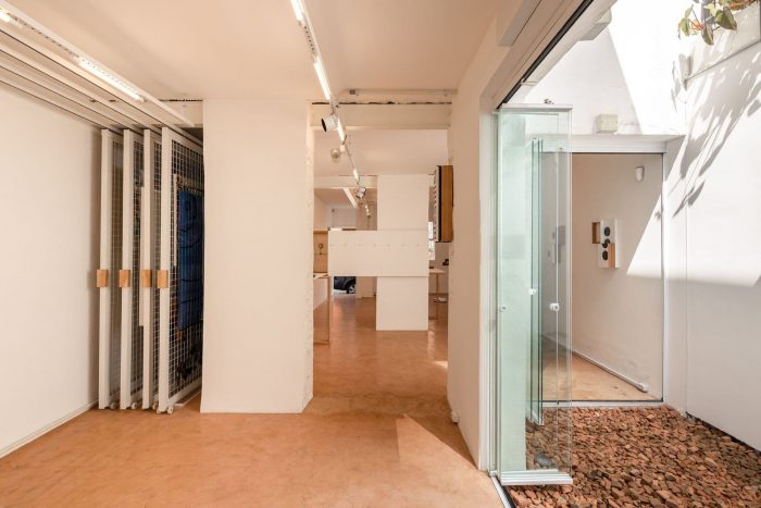 Gallery backup programs such as bathroom, cafeteria, library, and administration resources were placed on a 1,20m wide band, along the estate´s back wall. The reception desk was thought to be a mobile element, shifting positions throughout the gallery depending on each exhibition project.