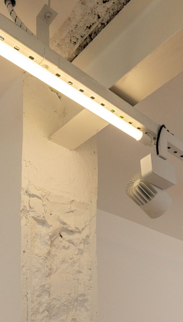 The lighting project was based on the premise of simplicity: three metal channel longitudinal lines run parallelly and connect themselves through wiring steel pipes, anchored on the ceiling slab. Tubular fluorescent lightbulbs were placed under the metal channels alongside with a few directable reflectors, all of which can easily be repositioned depending on each exhibition project.