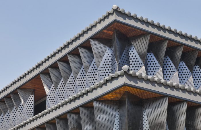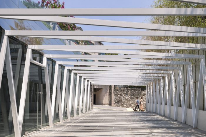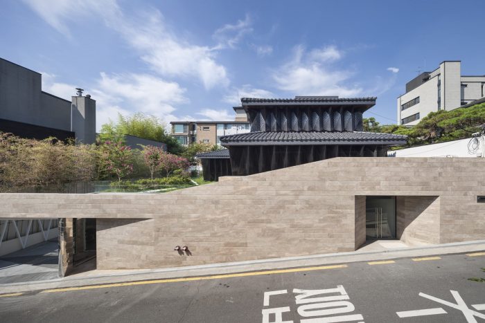 The existing geometry of red Giwa and bricks contrasts with the gray tetrahedrons of black stainless steel in terms of texture and material sentimentality. The different principles of geometry share heterogeneity and homogeneity and form a contact point at the same time. It is the tension between two co-existing things with no one being superior, and the balance point created by the sentimentality of time and space.