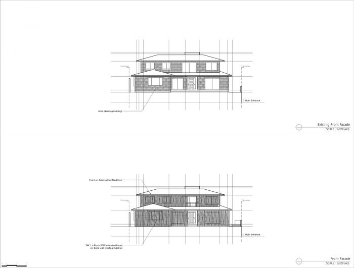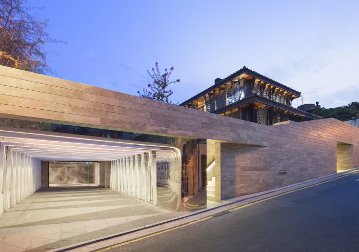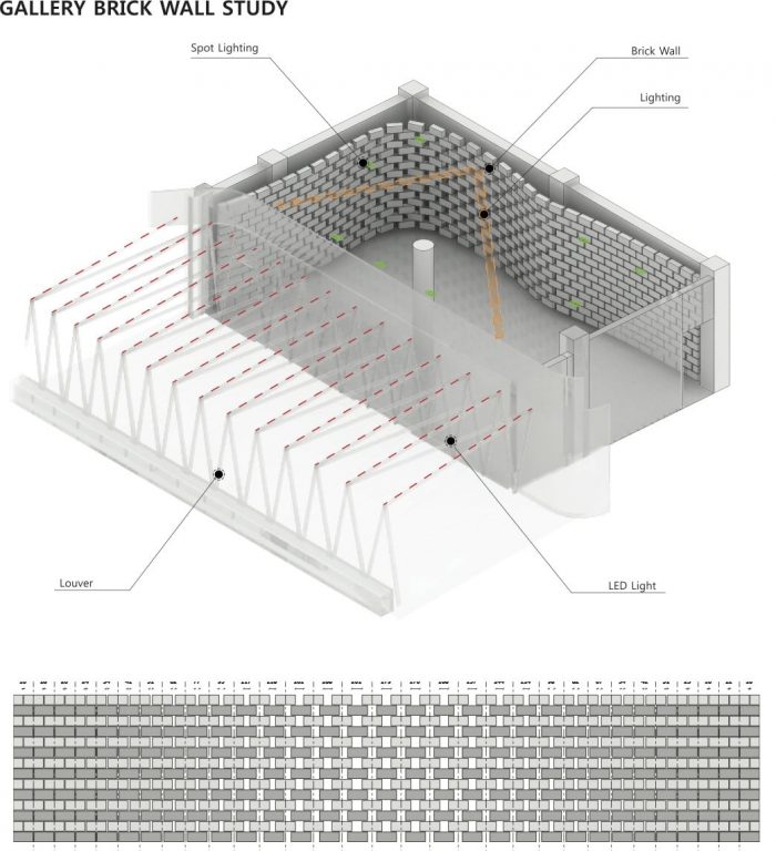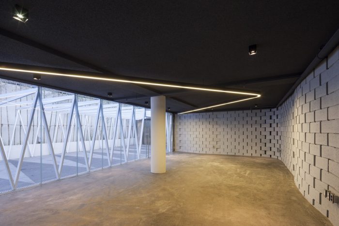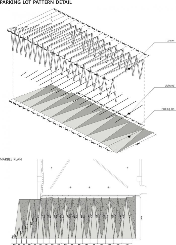 这个空间已被规划为提供停车空间,并被用作与地下室相连的各种形式的外部空间。为了保证这个停车空间,某个钢制杠杆图案被改变了角度,以交替使用上面的百叶窗和下面的石头来创造一个图案。在顶部的百叶窗内插入了LED装置,以便在夜间除了使用停车空间外,还可以进行各种活动。新的大理石外墙的水平流动与现有的停车空间相连接,使地下室的空间得到最大限度的利用,如一个画廊。在不改变容积率的情况下,地下室的空间被充分利用,以便为额外的扩展留出空间。上面的现有房屋拆除了现有的天花板材料,以开辟空间,方便租户使用。