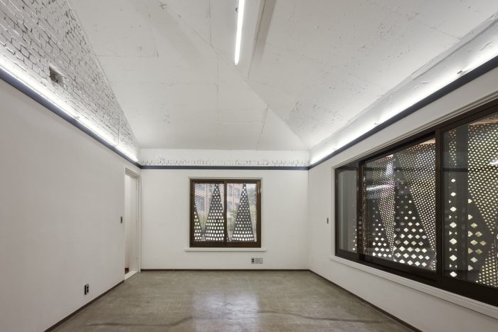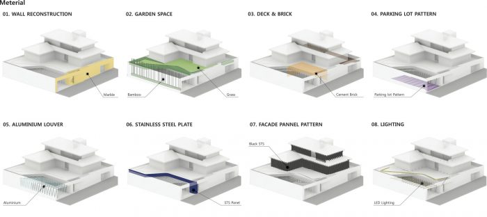This space has been planned to provide the parking space and to be used as various forms of exterior space connected to the basement. To secure this parking space, a certain steel lever pattern was changed in angle to alternate the louver on top and the stone on the bottom to create a pattern. LED units were inserted inside the louver on top to allow various activities at nighttime in addition to the use of space for parking. The horizontal flow of the new exterior walls in marble connects to the existing parking space to maximize the basement space for various uses such as a gallery. The basement space was used to the fullest without changing the floor space ratio to leave room for additional expansion. The existing house on top removed the existing ceiling materials to open up the space for the convenience of renters.