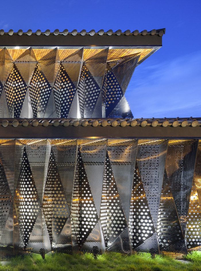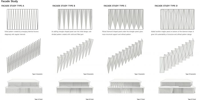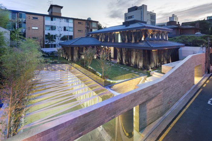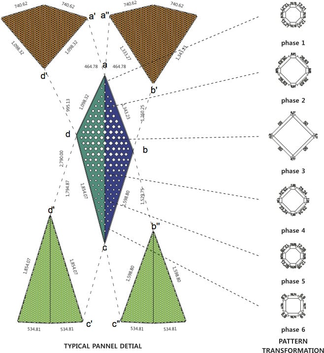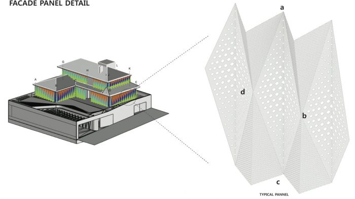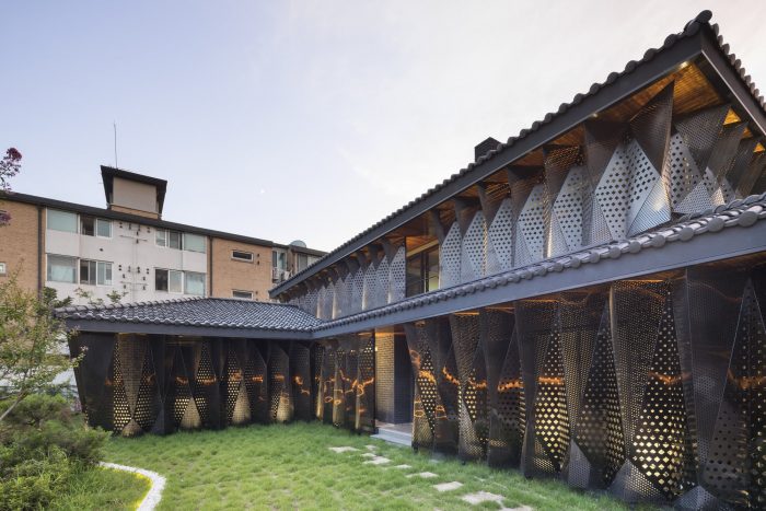 Eighty-seven black stainless steel tetrahedron blocks form the basic unit that encases the existing masonry walls. The exterior of black stainless steel cubes is a lump of skin made of 530 triangles and rhombuses. In other words, the 530 geometric shapes are divided and reconfigured by the bored plates on top and bottom and the laser-cut triangles on the center. The pattern of about 200,000 bored circles and 15,000 geometric patterns filter the light from the outside in various quantities and qualities. Light is reorganized and the space is newly configured. The past footsteps are reconfigured by geometry and the space is given the sense of time by the change of geometric light.