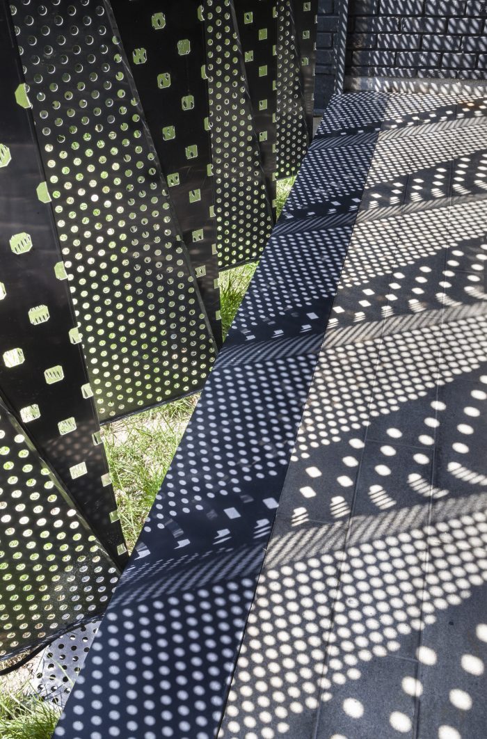 八十七个黑色不锈钢四面体块构成了包裹现有砖石墙的基本单元。黑色不锈钢方块的外表是由530个三角形和菱形组成的一坨皮肤。换句话说,这530个几何形状被顶部和底部的钻孔板以及中心的激光切割三角形分割和重新配置。约200,000个钻孔圆和15,000个几何图案以不同数量和质量过滤来自外部的光线。光线被重新组织,空间被新的配置。过去的脚步声被几何图形重新配置,空间被几何图形的光线变化赋予了时间感。
