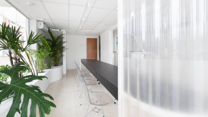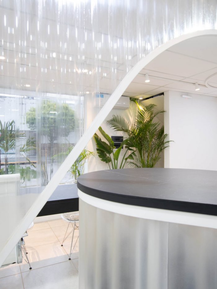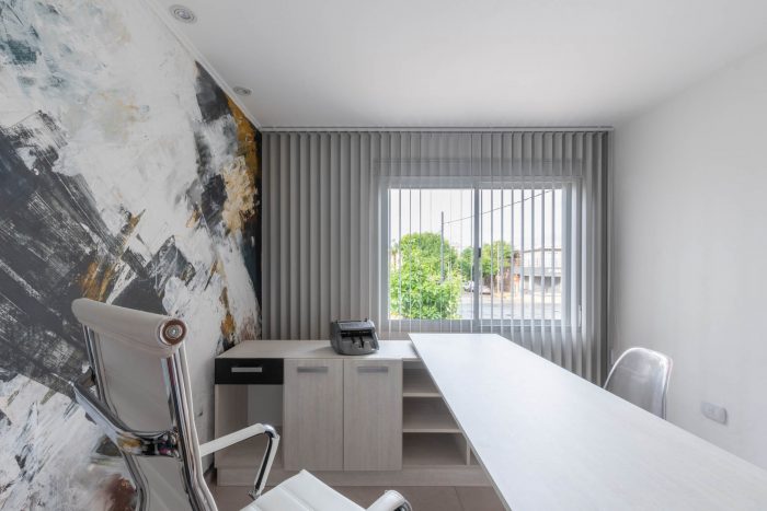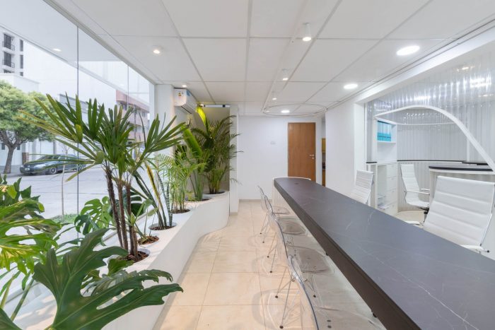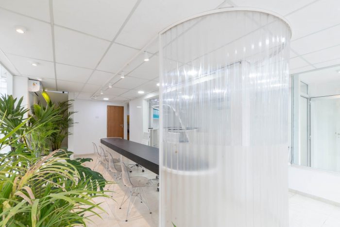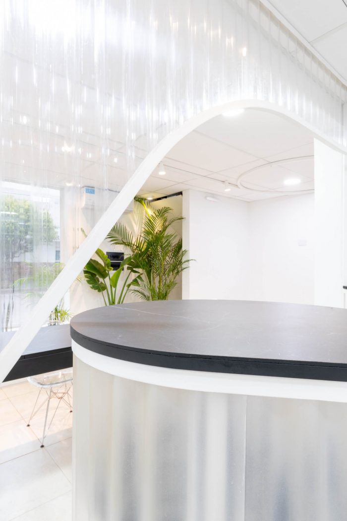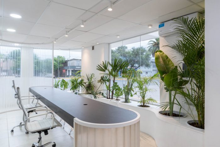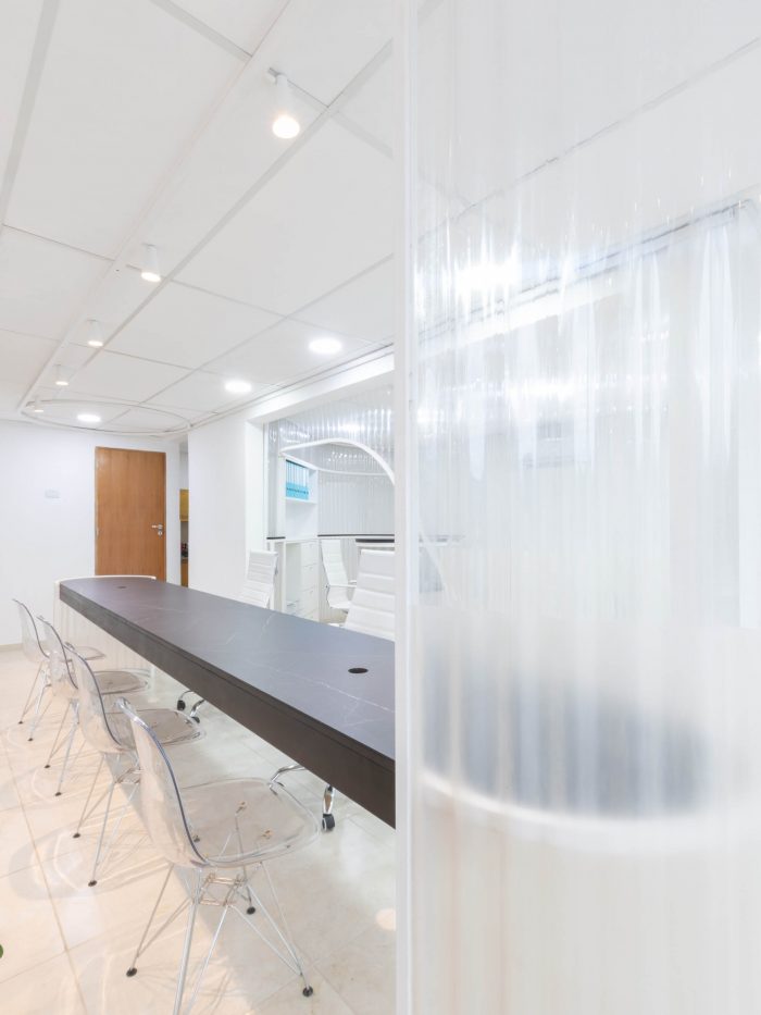 This material, used as an envelope for the central device, is supported by a structure made up of metal guides that, anchored to the ceiling and the floor, give rigidity to the shape. The minimalist aesthetic is manifested in the purity of the white color of almost all the elements, and in the contrast with the black color of the horizontal support surfaces. Thus, a result is achieved with zero visual saturation, but with an aesthetic and formal impulse. The warmth and color are provided by the natural plants that are located in the contour of the entire glazed sector of the facade in the internal part of the room.