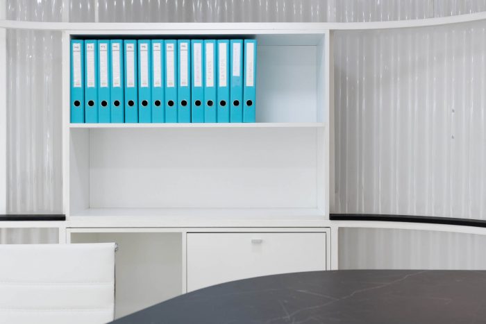 Through a single device, the various functional sectors (entrance, waiting, reception, archive and consultations) are organized on the ground floor, while the movement of people is guided and the furniture is made up. The space for the meeting room is reserved for the upper floor, where it is possible to find the necessary sound insulation.