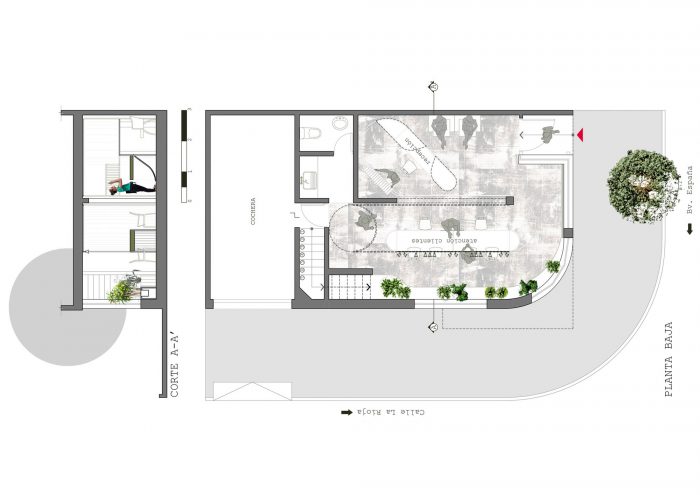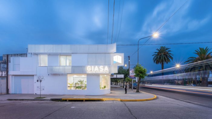 The place is located on a corner on one of the busiest roads entering the city. This condition was used to give visibility to the intervention from different angles and at different times of the day. The panels that make up the corner volume, which can be appreciated by both pedestrians and vehicle drivers, allow the facade to be approached from both streets and also diagonally. To achieve optimal visibility, the geometry of the corner "flies over" the public space of the sidewalk and advances on the line where the building ends. The curvatures of this volume move the movement generated by the panels that organize the ground floor outwards. The exterior lighting remains on and becomes a "beacon" when daylight ceases.