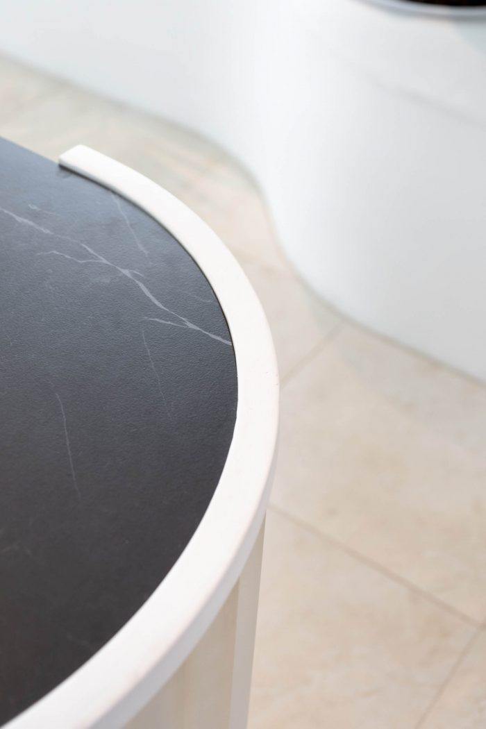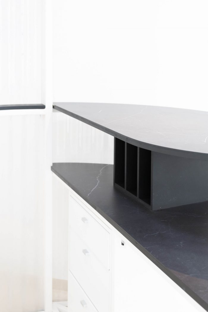 这种材料作为中央设备的外壳,由金属导轨组成的结构支撑,固定在天花板和地板上,使形状更加坚固。极简主义美学体现在几乎所有元素的白色纯度上,以及与水平支撑面的黑色对比上。因此,达到了视觉饱和度为零的效果,但却有一种美学和形式上的冲动。温暖和色彩是由自然植物提供的,这些植物位于房间内部的整个外墙玻璃部门的轮廓中。