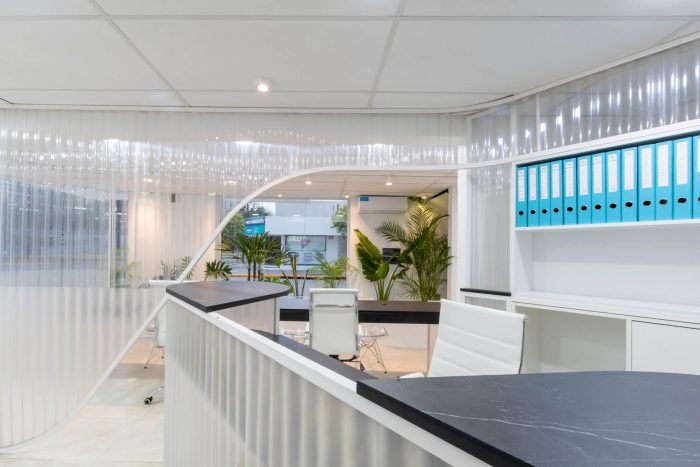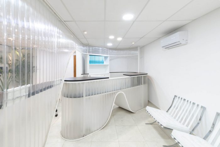 The strategy of using a material widely known in the field of architecture in a completely renewed way offers many possibilities. The everyday becomes innovative when a "corrugated" sheet (metal or plastic) appears used vertically, as opposed to its traditional horizontality. The project appropriates its texture and its flexibility to create curvatures and, at the same time, accentuate the direction of its lines. It works both on the outside (with opaque panels) and on the inside, where translucent and transparent panels are combined that provide various conditions of visual isolation depending on the case.