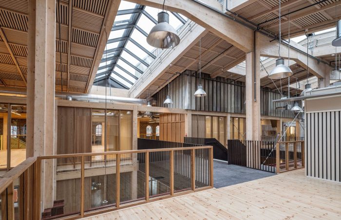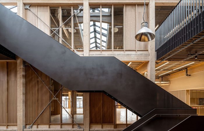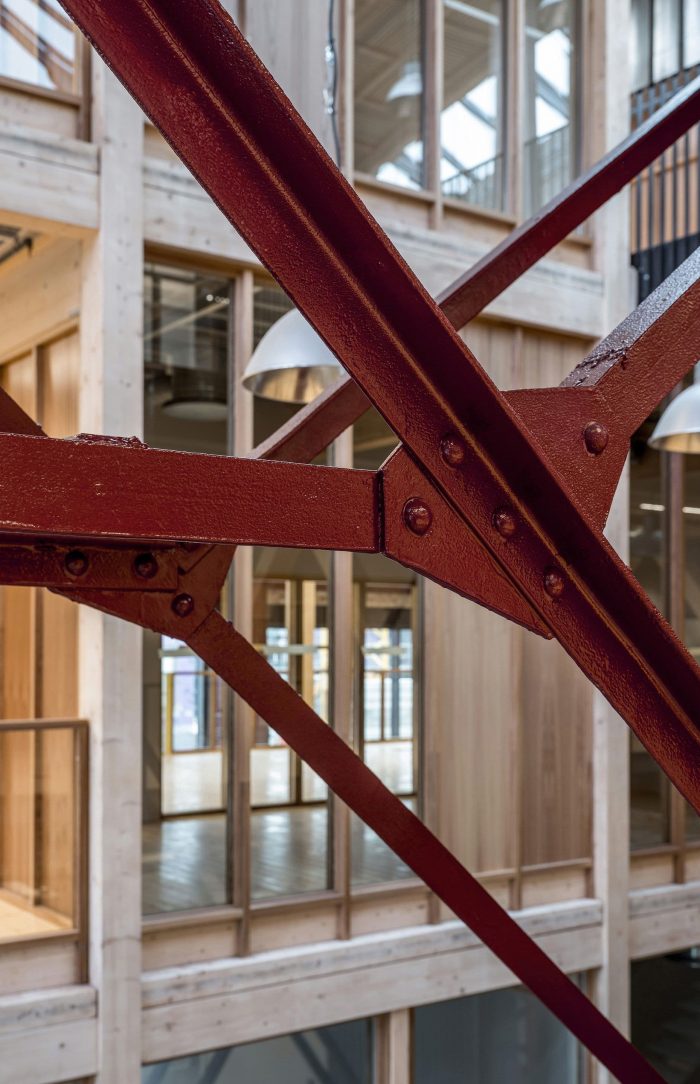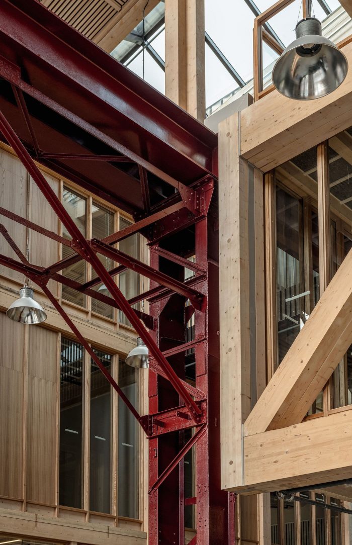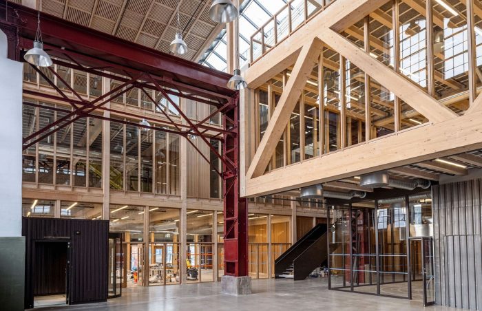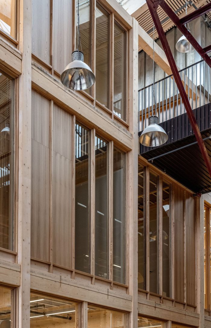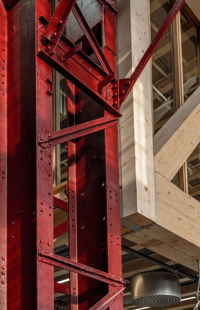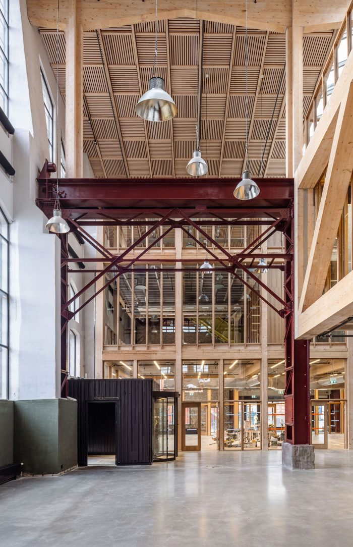 The overarching project ethos placed an acute emphasis on resource preservation and a minimal carbon footprint; what can be built within planetary boundaries, and what materials were already available to achieve the most sustainable outcomes? Varvsstaden had made an enlightened head start, creating a material bank in a nearby warehouse stocked with upcycled materials from other disassembled wharf buildings. Central to the sustainable reuse approach this ‘library of things’; bricks, sheet metal, corrugated panels, stairs, light fittings, and more, became the project’s primary building resource and main design driver. Additions to the existing steel frame are in glulam timber and CLT; wherever possible new materials required were sourced from local and renewable sources.