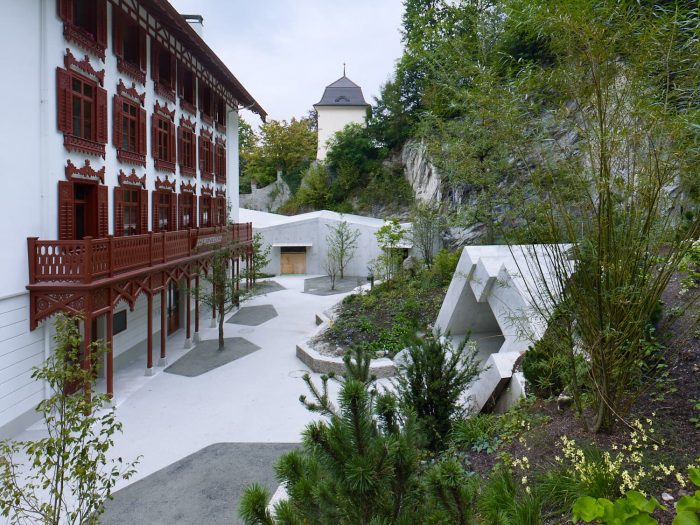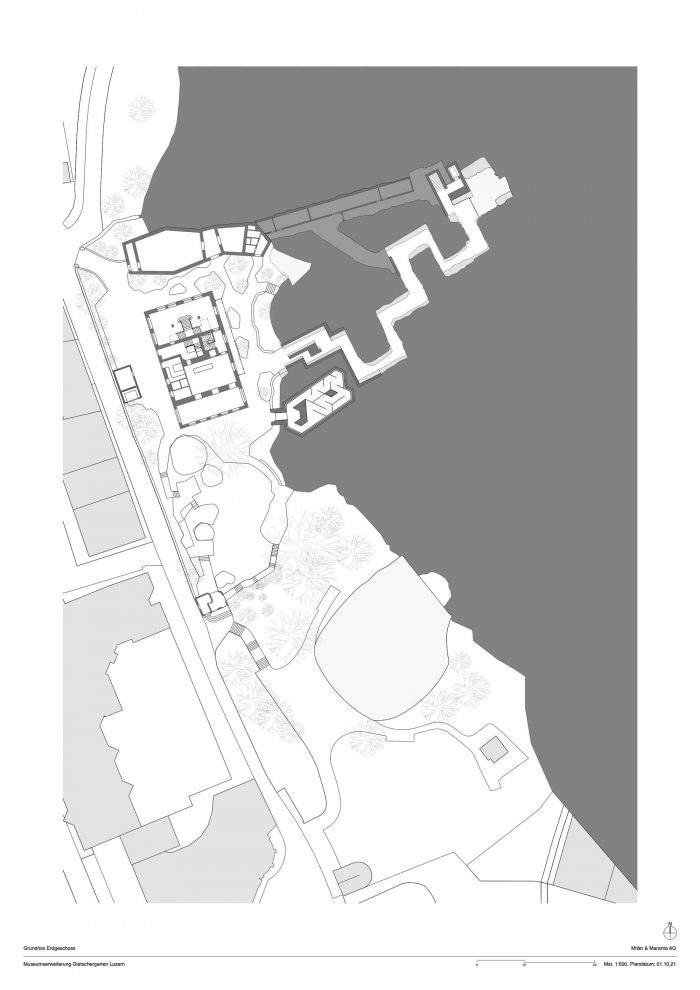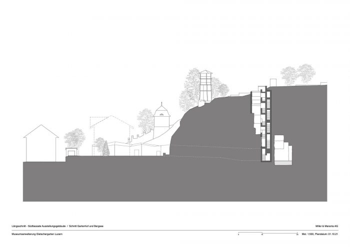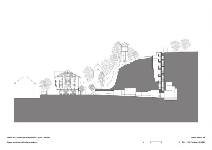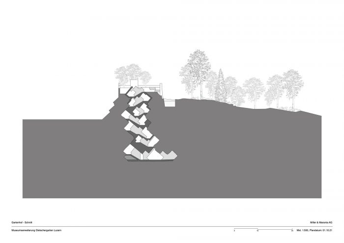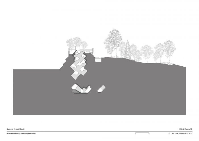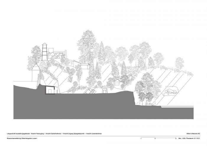 The present project envisages clarifying the situation of the Schweizerhaus by dismantling the annexes and thus enlarging the area of the park. This creates the possibility of redefining the park as a large landscape garden and dividing it into coherent areas. Next to the Schweizerhaus, a central square is to be created, from which the various exhibition elements will be made accessible: The Gletschertöpfe, the rock path to the Sommerau, the Schweizerhaus and the new exhibition rooms with the mirror labyrinth in the basement.