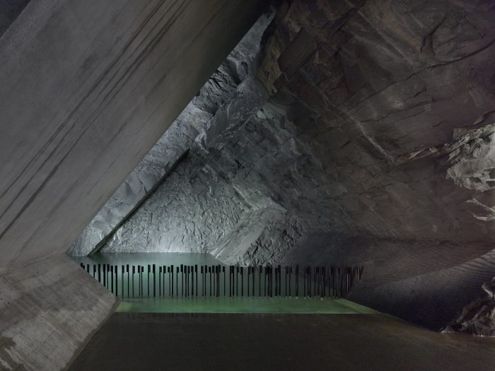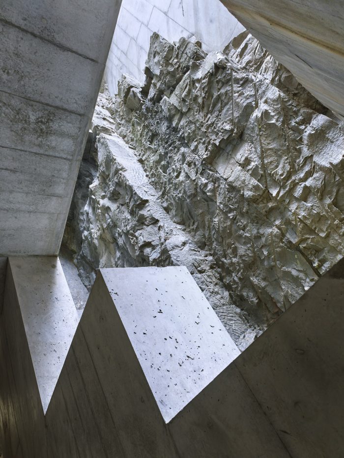 The strong spatial mood is shaped by the predominant material, stone, and the elemental experiences of light and darkness, confinement and expanse, sound and silence. The geometry and location of the rooms are oriented to the predominant oblique layering of the sandstone and the existing fissures. This leads to oblique cross-sections of corridors and caverns, which reinforces the specific perception of the spaces. The rock is left visible in many places and only secured where necessary for safety reasons. The path ends in a large cavern that collects rainwater entering from the earth's surface into a mountain lake.