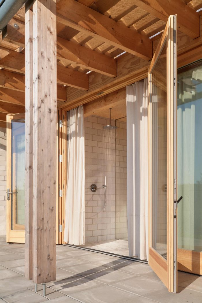 The house has a simple floor plan with a curved wall that creates privacy toward the road. All rooms overlook the open landscape to the west and have access to the large covered terrace. The beds are positioned along the facade so they can be accessed both from the inside and directly from the terrace. Likewise, the shower can be reached directly from the outside. When the long row of glass doors is open, the small bedrooms and shower feel like alcoves along the covered terrace.