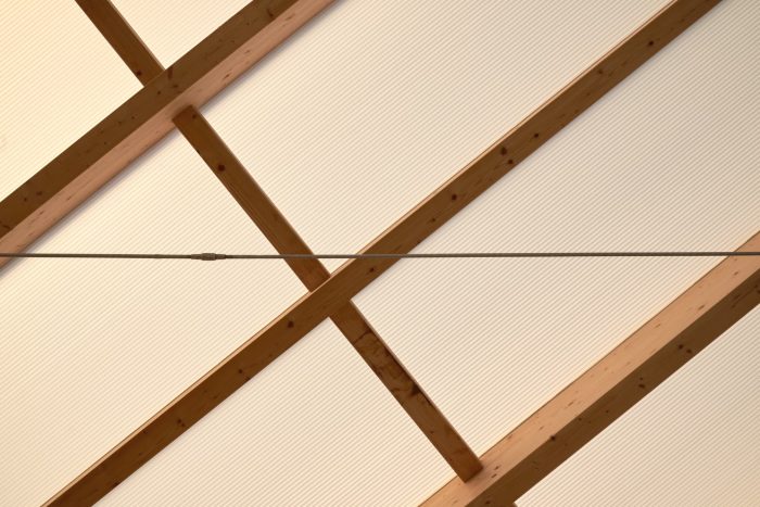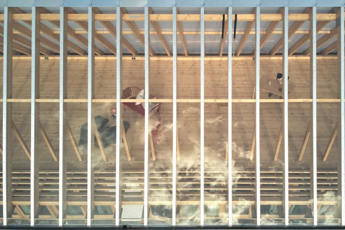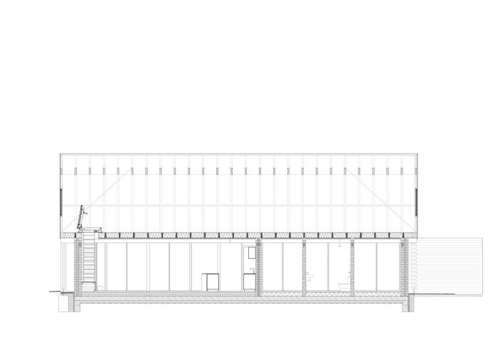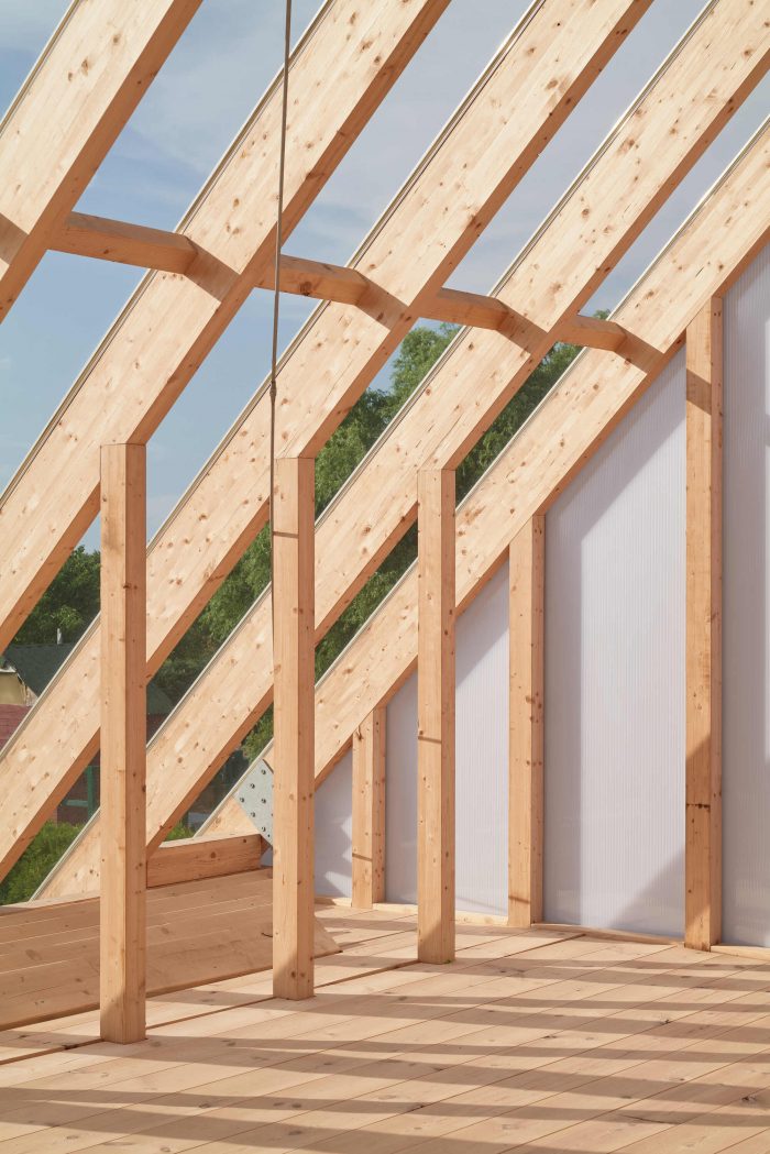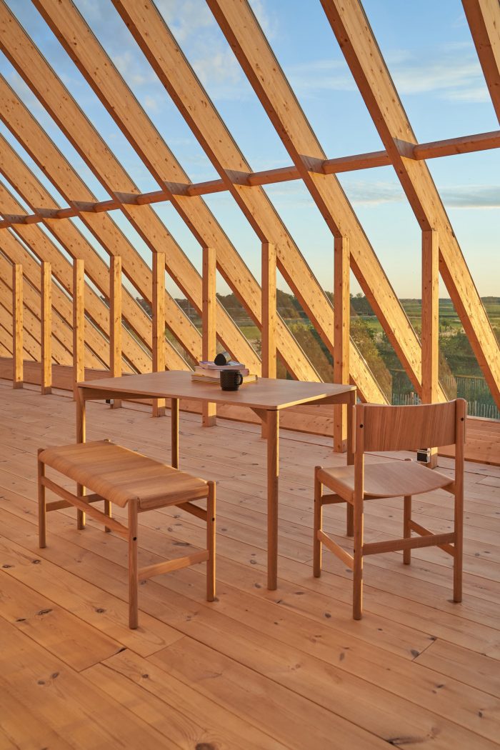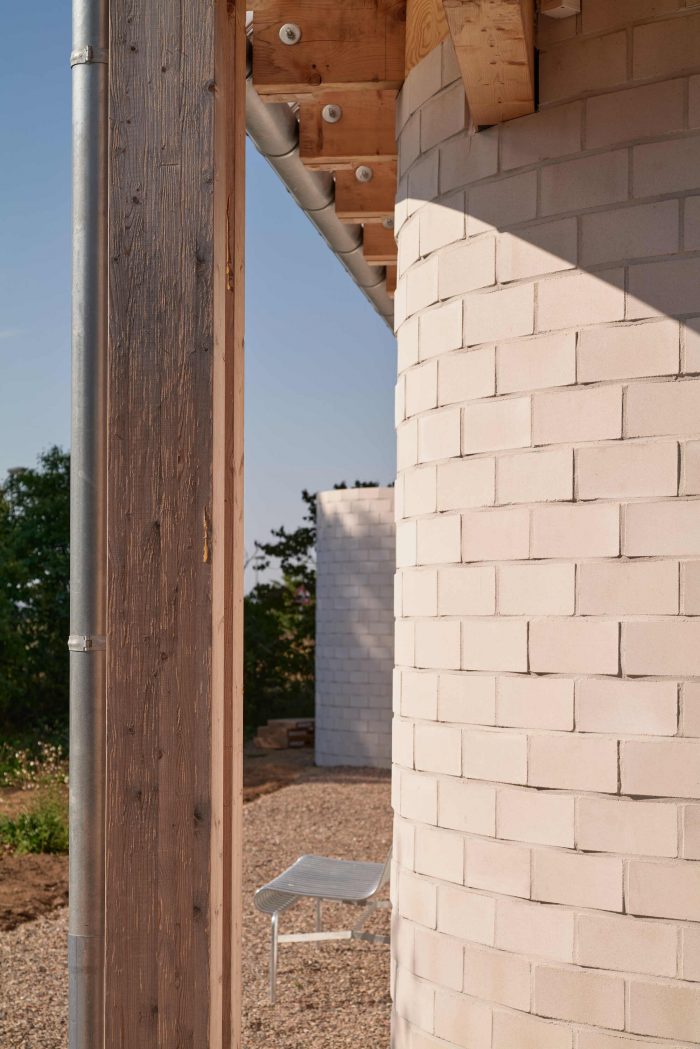 The staircase and the kitchen block are built into solid volumes of concrete bricks that frame the main living space. The curved stone wall is recessed towards the east to create a small court for the first rays of morning sun protected from the wind. The wooden structure of the roof forms a greenhouse on the first floor. It contains a large and bright space that functions as a studio for creative work and a great place to enjoy the view and daylight regardless of the changing weather.