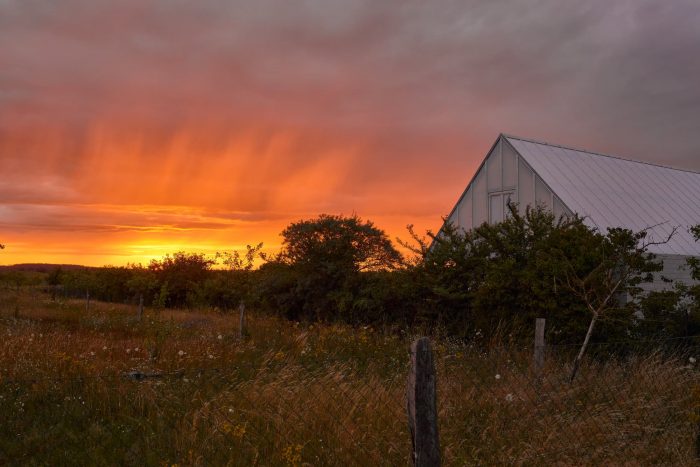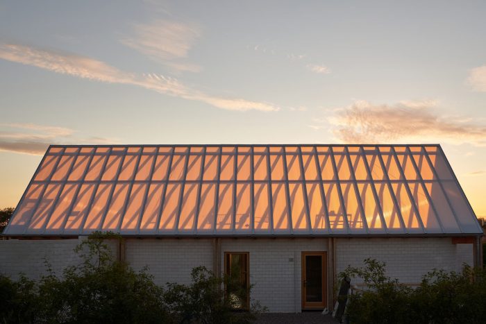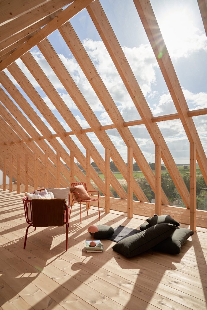 In the warm seasons, interior and exterior spaces grow together through the many openings on the garden facade. The interior of the house appears to merge with the garden defined by the curving wall of the house and the green hedges of the garden. In the winter, the compact insulated one-story house becomes a cozy and intimate place to withdraw and see the landscape and changing light through the panoramic windows. The greenhouse upstairs is an extra feature that can be used when the sun has warmed it up, or the wind has cooled it down.