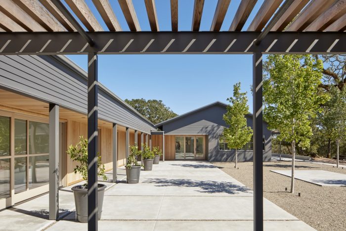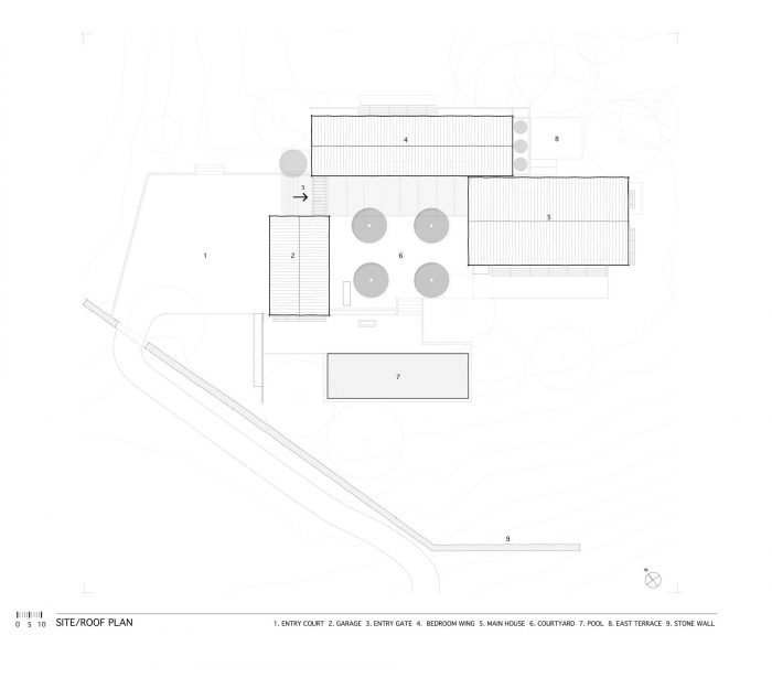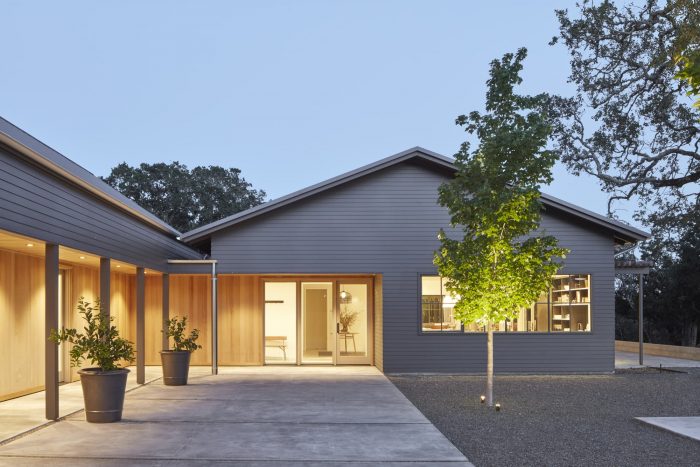 Located on a 10-acre vineyard and scrub oak site, this single-family residence was designed to integrate the foundations and roof of a small existing house into the new architectural composition.