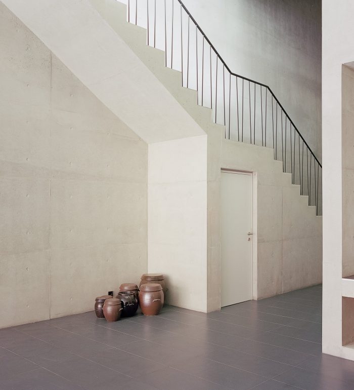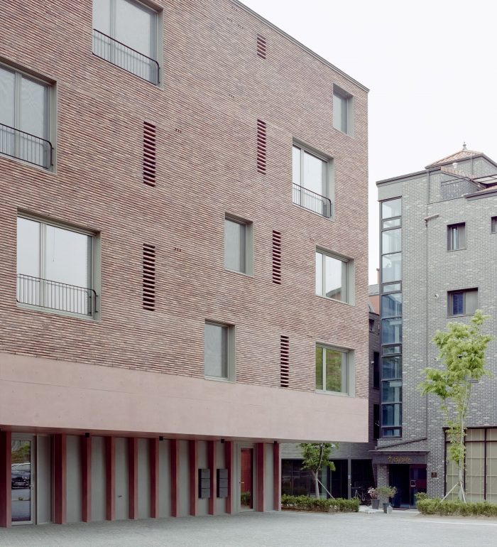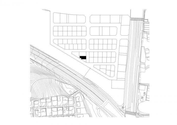 The building is in the city of Seongnam, south of Seoul, South Korea. It stands on a lot at the end of an expanding neighborhood. The original conformation of the project land is irregular and is located between a neighborhood street to the south and a bordering terrain on the north side. The rectangular volume develops along the north side of the perimeter and fits into the urban context in a position set back from the road, underlining the desire to obtain an urban void that allows a pedestrian and vehicular entrance to the building.
