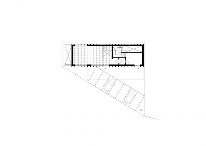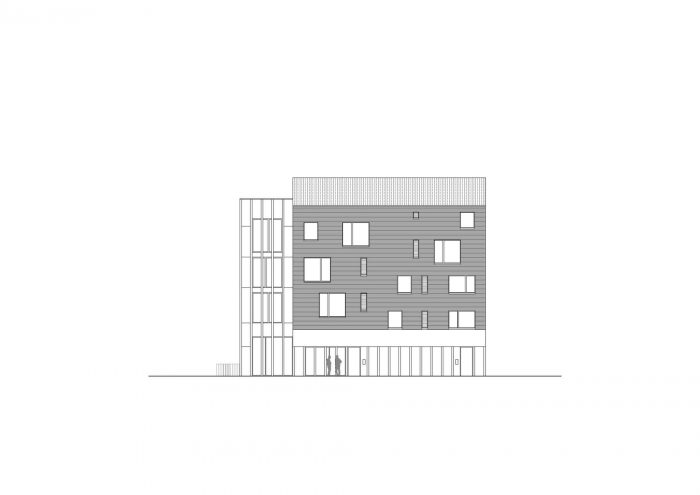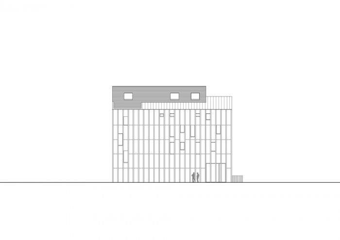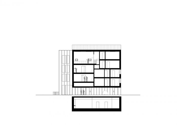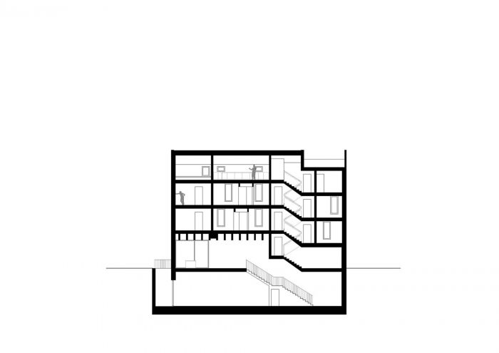 事实上,底层和地下室是对公众开放的商业活动场所;另一方面,在高层有不同大小的公寓。体积构成被分为两个不同的体,它们配合在一起,产生一个纯粹、清晰和可识别的形状。