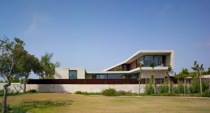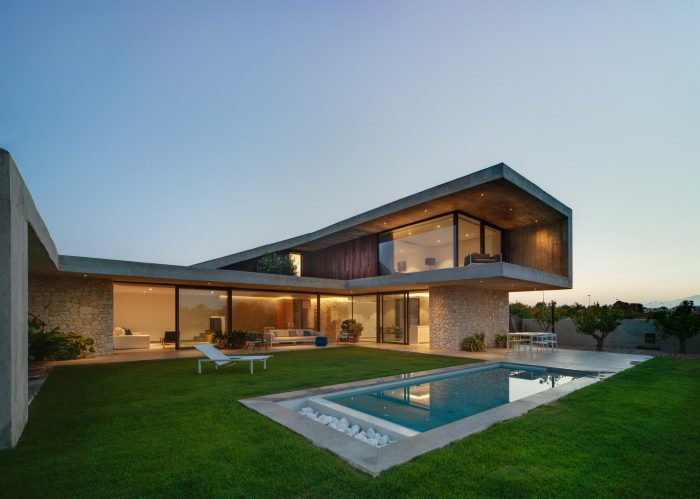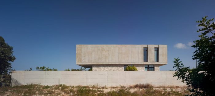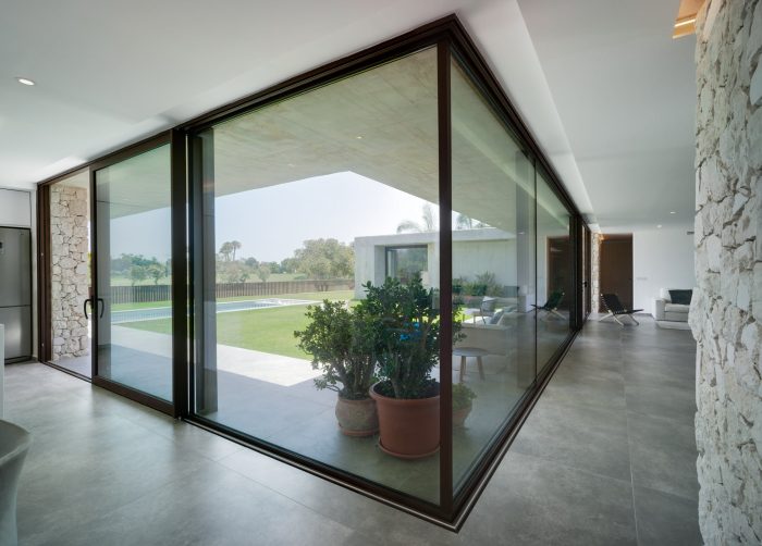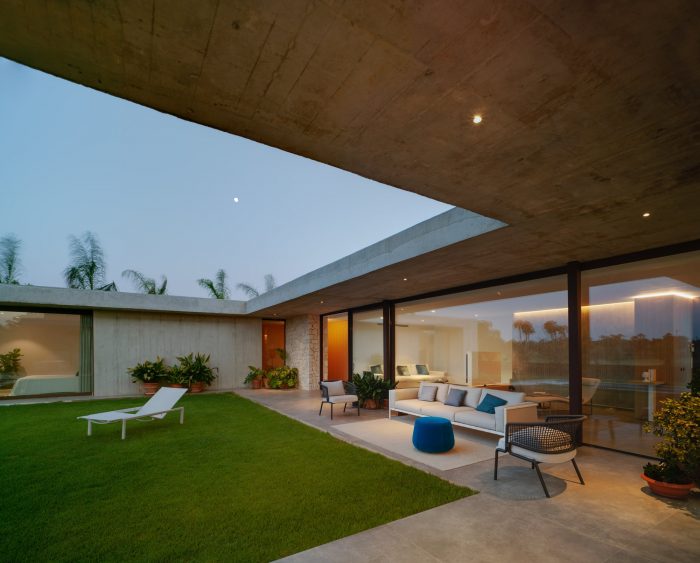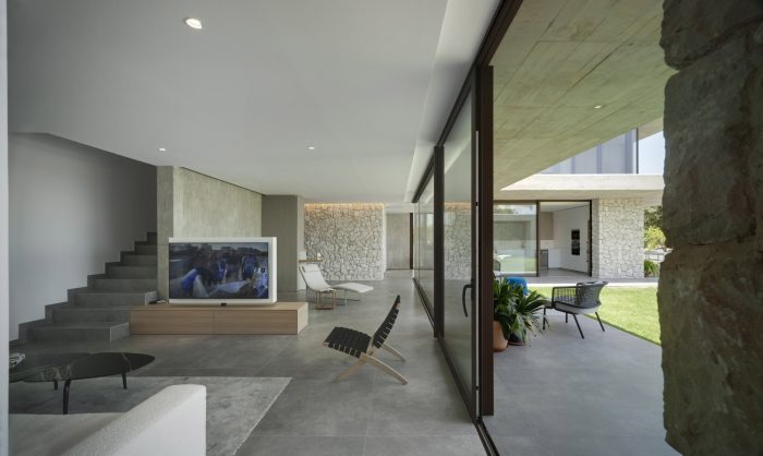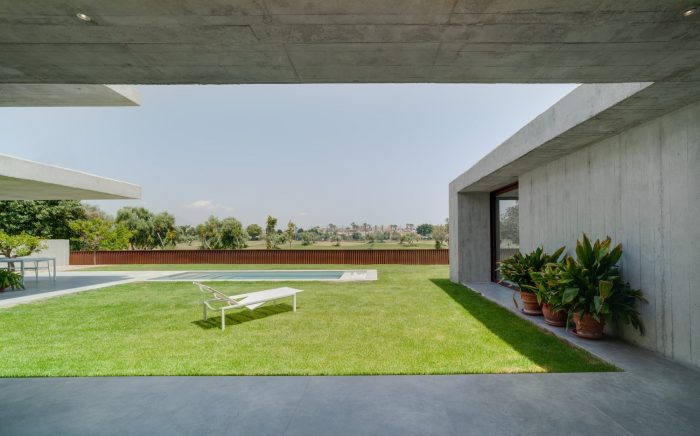 Concrete and masonry work take centre stage in the property. The overbearing, opaque and rigid appearance noted from the outside becomes light and fluid within the private areas, thus converging as a concrete laminate that creates the spaces that frame the large glazed windows.
