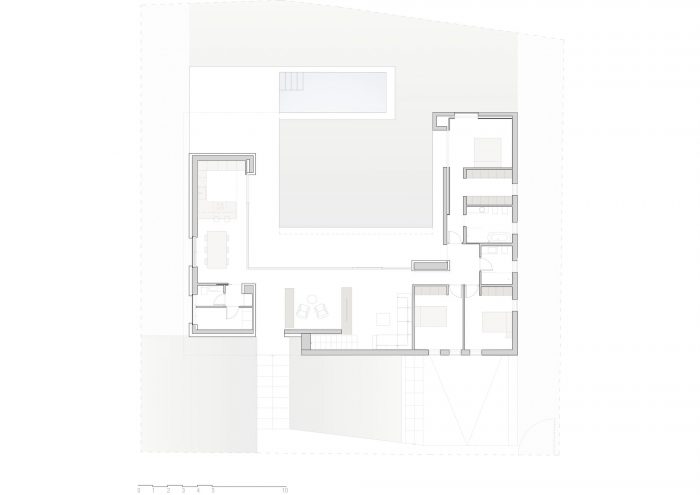 Through its “U” shaped layout, we sought to enclose the space to the outside, isolating it from the neighbouring buildings, opening northwards, where the dweller will socialise, and from where the main views can be seen. It is there where the house becomes permeable, without losing sight of much sought after cosy spaces.