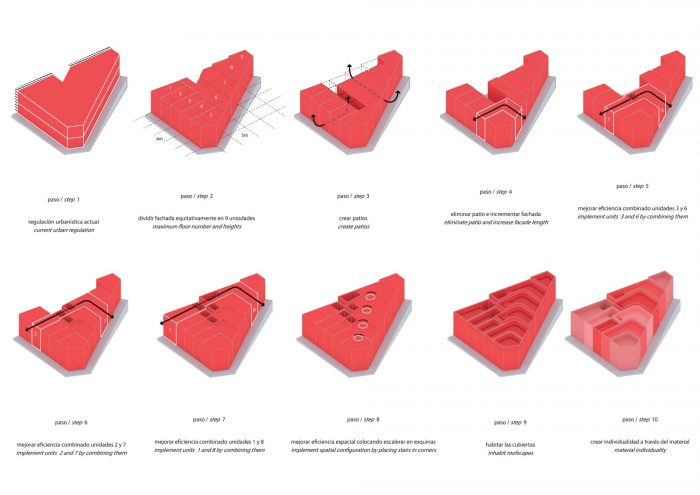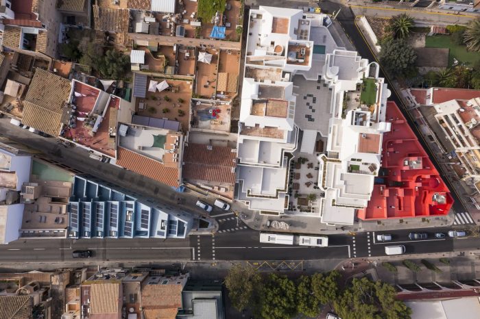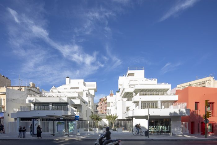 The five buildings completed in phase one include the Gomila Center, which forms the heart of the neighborhood. A renovation of a 1979 design by architect Pere Nicolau, on the ground floor this white building features a spacious patio, with a restaurant, office spaces, and apartments rising around this central feature in a series of stepping terraces and balconies. Next to the Gomila Centre are the red townhouses known as Las Casitas, which are topped by a landscape of rooftop terraces allowing neighboring residents to socialize together.