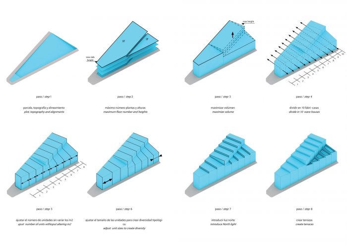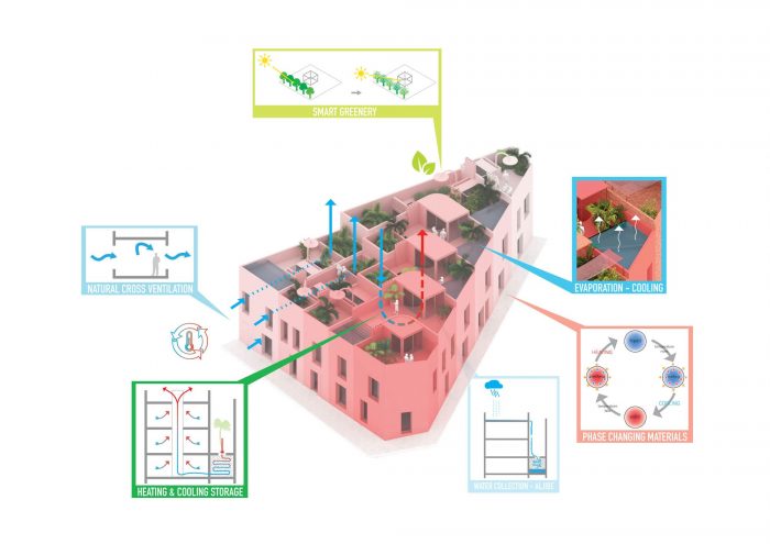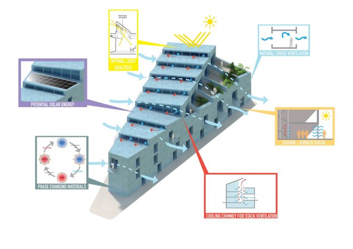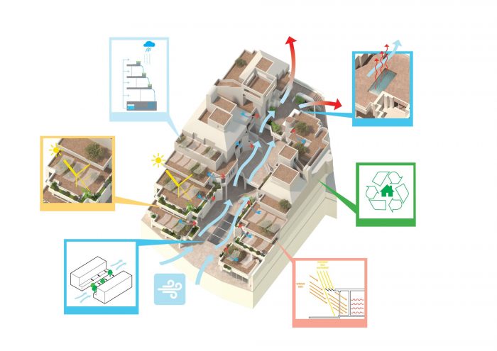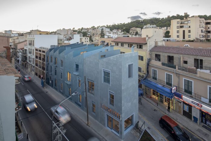 The Gomila buildings are energy neutral, using many of the same principles developed for the Passivhaus standard including high thermal efficiency and passive climate control measures such as shutters and cross ventilation to reduce energy needs. To utilize the many sun hours of Mallorca, the rooftops host solar panels while heat recovery systems further reduce the buildings’ energy consumption. Many of the materials have been sourced locally, reducing the carbon produced by the construction.