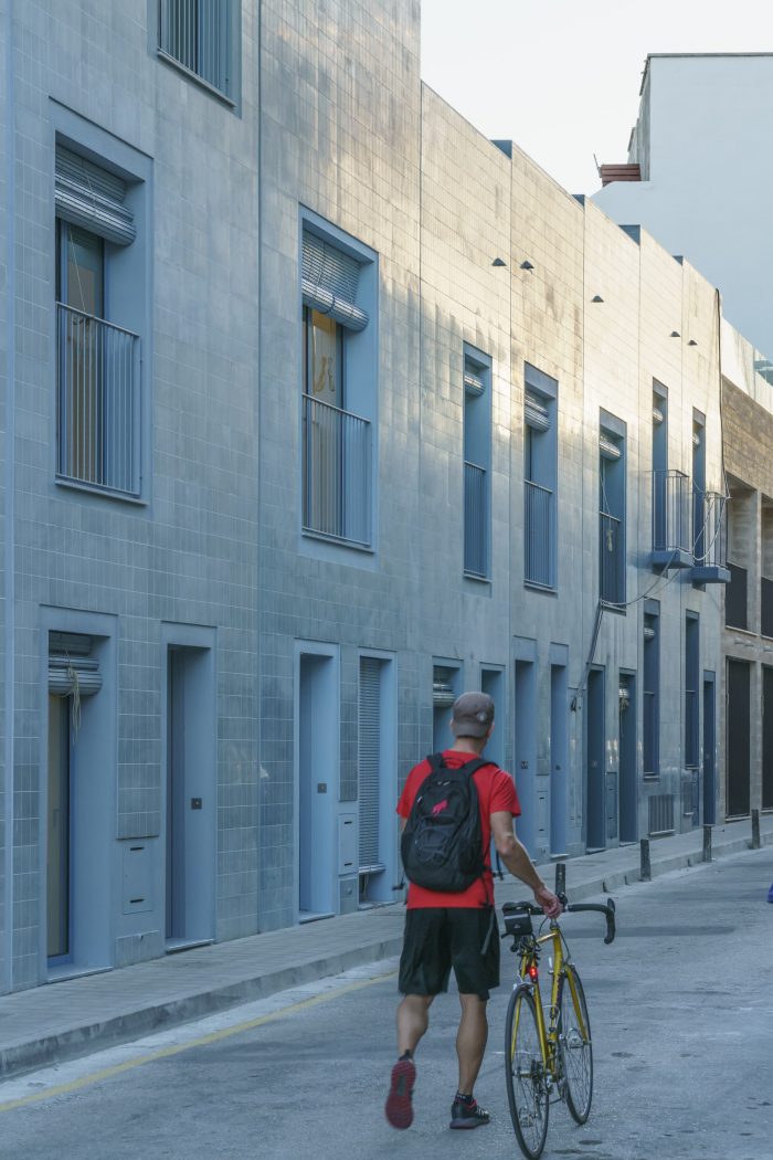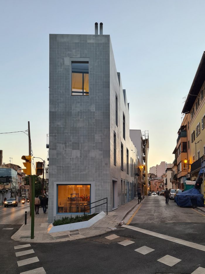 On the other side of the Gomila Center, located on a prominent street corner, is Las Fabri-Casas, a set of row houses with a saw-tooth roof completed with blue ceramic façades. Tucked behind this is a low-carbon apartment building constructed of compressed earth blocks, with a communal rooftop swimming pool that offers views towards the nearby Bellver Castle. Finally, across the street on the Plaza Gomila itself is the green building La Plaza, a transformation of an existing building that hosts a revival of the historic bar Bellver, offices, and a communal rooftop with views of the bay and the cathedral.