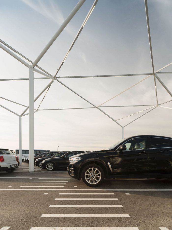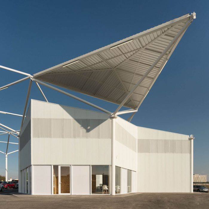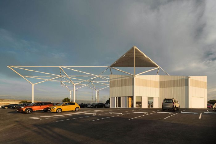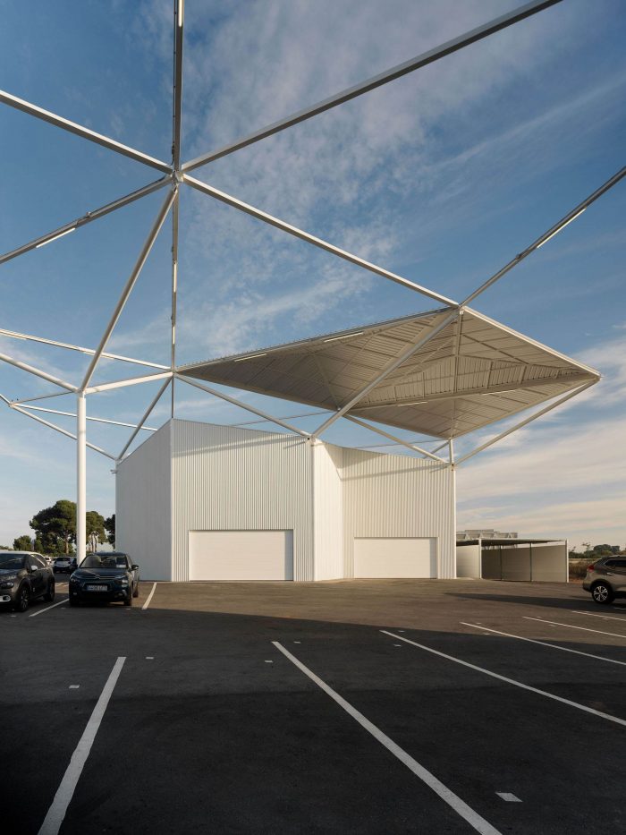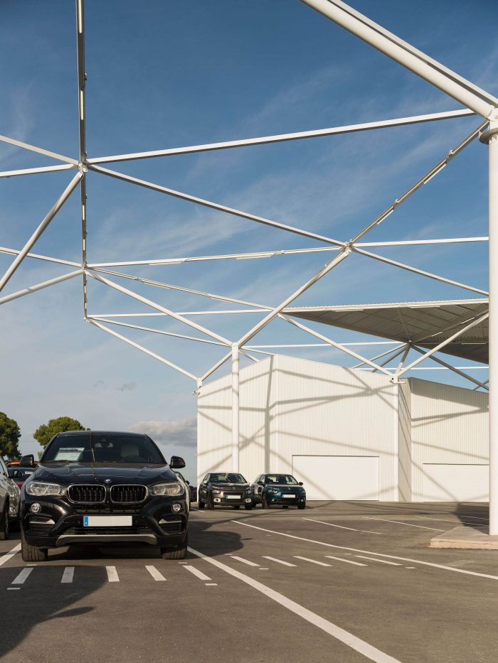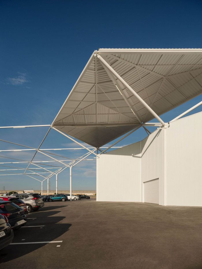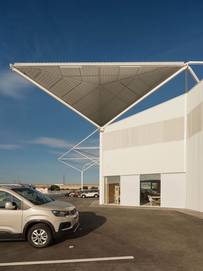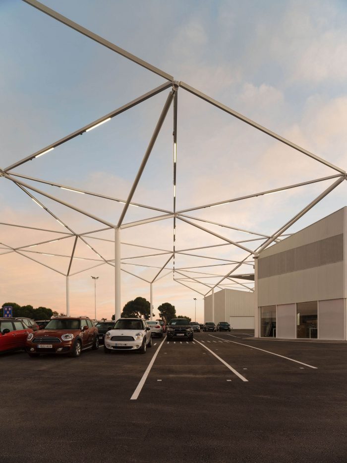 Between the cities of Reus and Tarragona there is GOMotor, a second-hand vehicle shop with an exhibition center, located in an area of 6600m². The project seeks to display a high stock of vehicles in the most visual way possible. Due to their number, it is necessary to see them in a row, but the parallel arrangement would only show us the cars from the front. Parked diagonally, however, we can quickly capture its overall picture. For this reason, the obliquity of the parking lots is taken as the norm and a grid of axes in three directions is established instead of a classic orthogonal grid. On top of the triangulation, a structural system is developed that spans the project area while adapting to each part of the program.