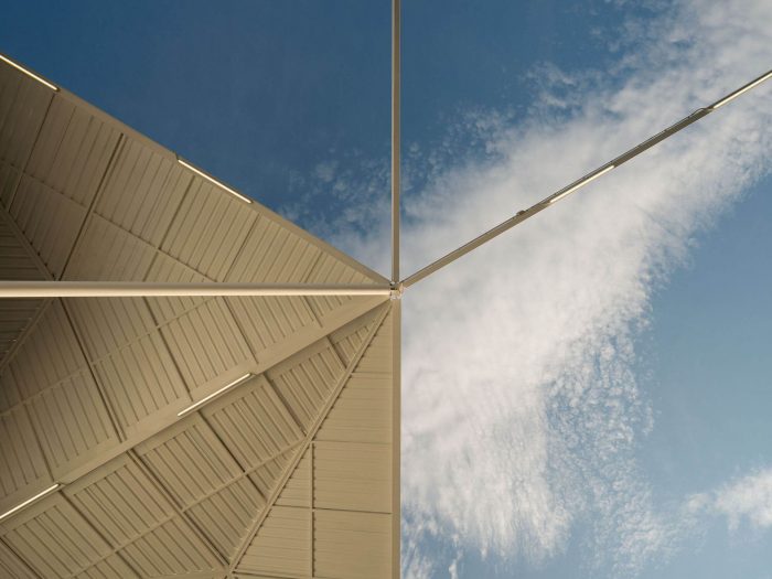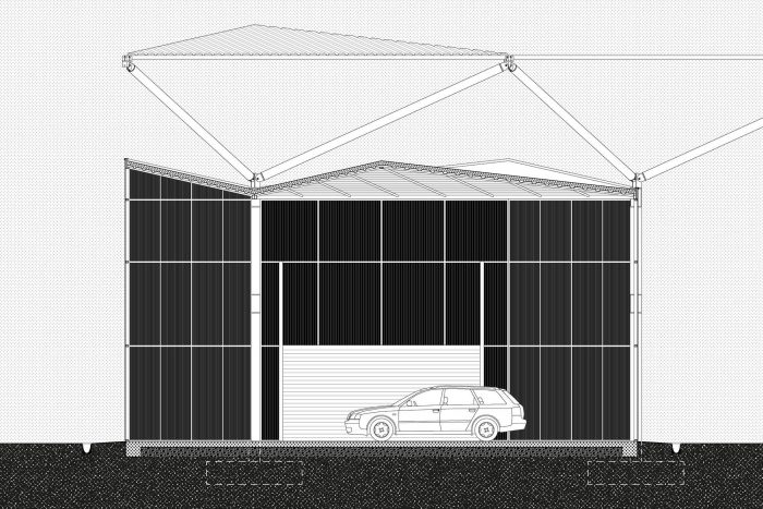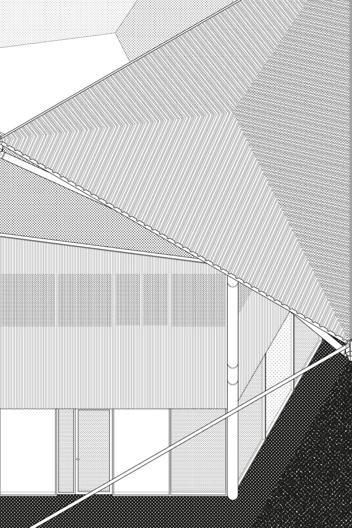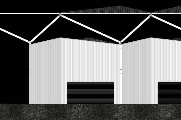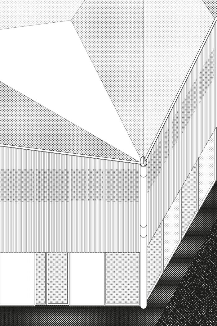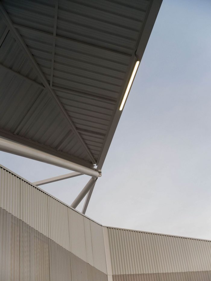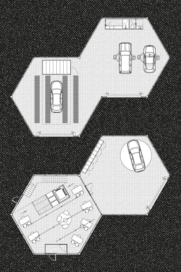On the edge of the complex, there are four hexagonal buildings that contain a complementary program to the exhibition area. Except for this point, the rest of the structure is uncovered. The bars, in addition to determining the display area, illuminate the vehicles. Along with the buildings, the general structure is covered generating porches at a higher height. The overlapping of roofs indicates the access areas, and the change in scale helps to articulate the role of each building in the complex.