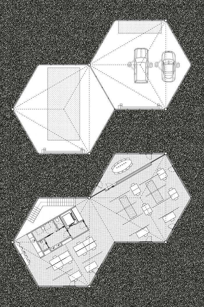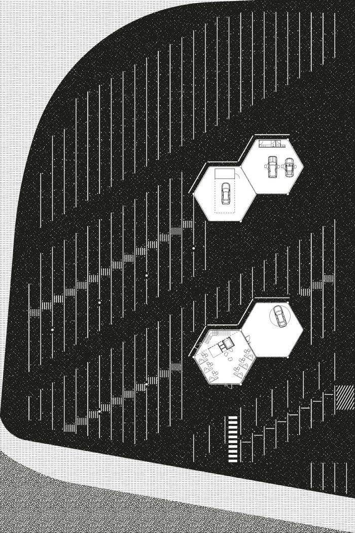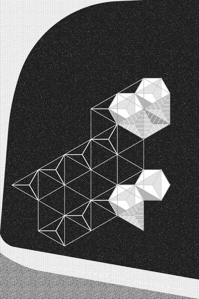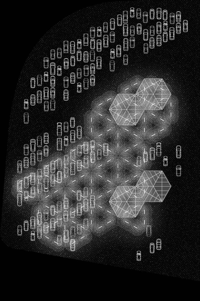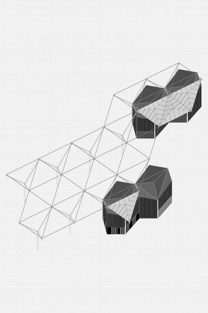 在建筑群的边缘,有四个六边形的建筑,包含了对展览区的补充方案。除了这一点,结构的其余部分都没有覆盖。酒吧除了决定展示区外,还照亮了车辆。与建筑物一起,总体结构在较高的高度上覆盖着生成的门廊。屋顶的重叠表明了通道区域,而规模的变化有助于阐明每个建筑在建筑群中的作用。