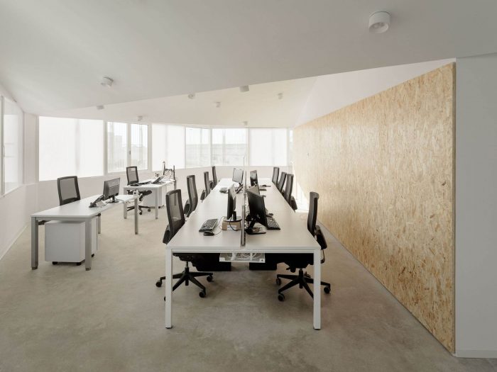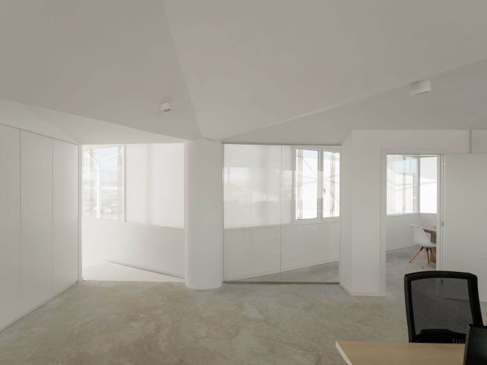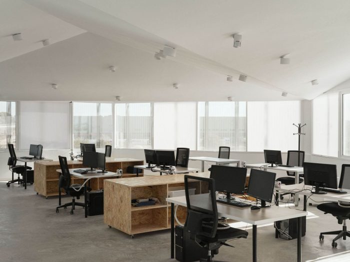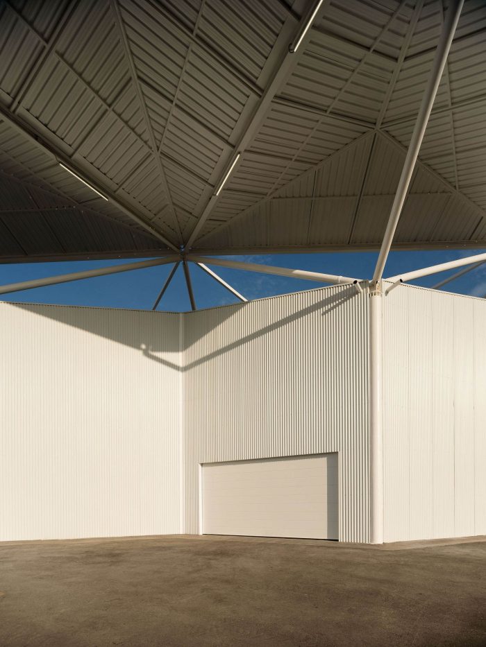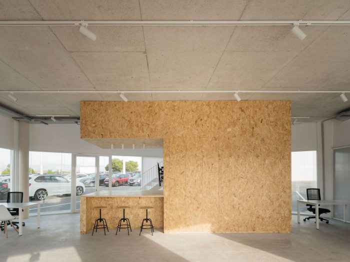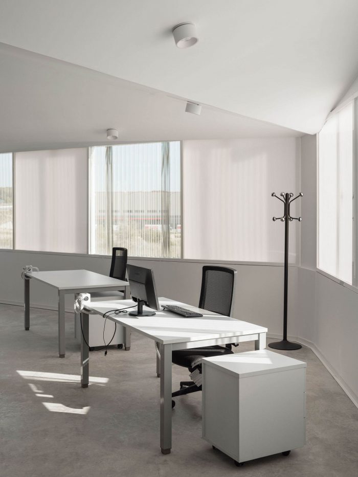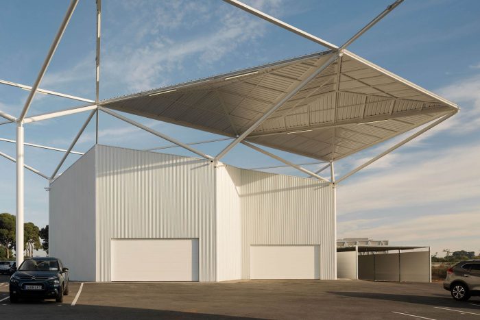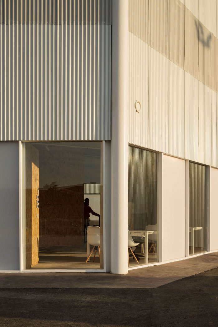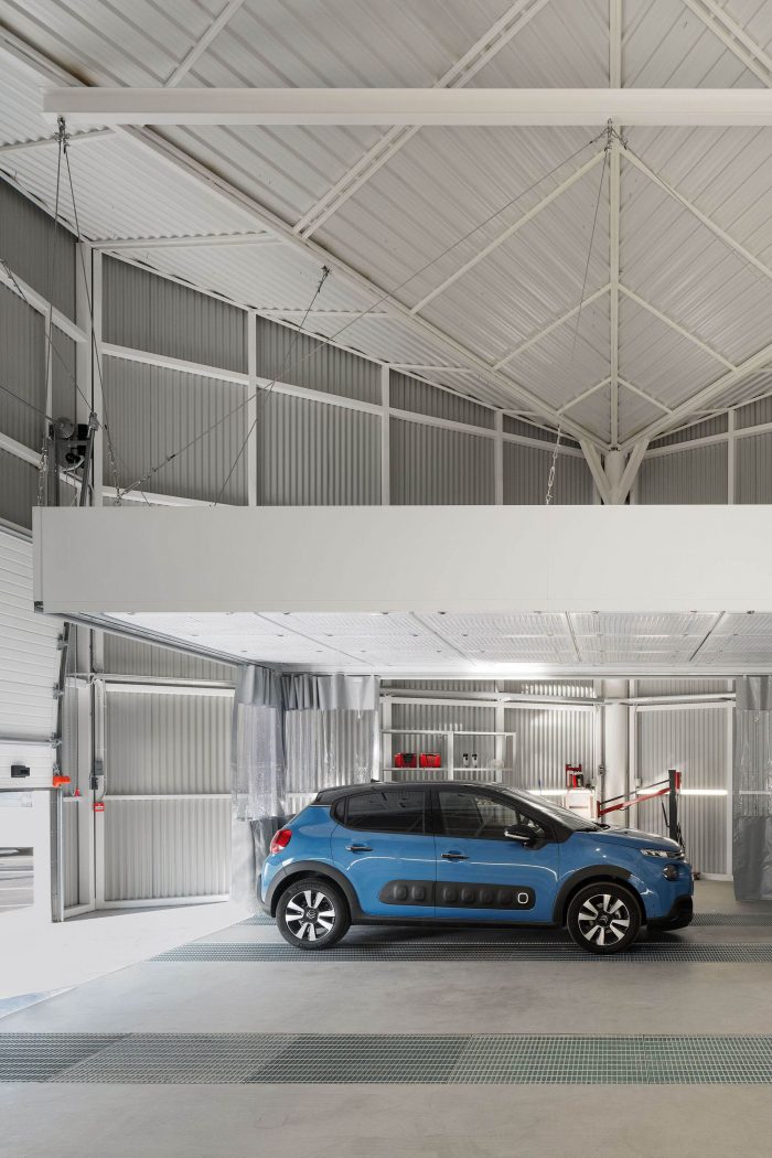 The work buildings, on the other hand, are divided into two floors. On the lower floor, there is a meeting and rest area and a space to photograph the vehicles. The upper floor contains the offices. Due to the characteristics of this space, unlike the workshops, the interior is covered with finishes that hide the supporting structure and provide thermal insulation. On the ground floor, the façade rises from the ground, leaving a visual strip open to the outside. Above, a horizontal stripe of windows let in an optimal light for the work, filtered through the sheet.